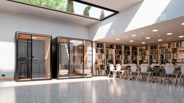 Cabina mediana, ideal para dos personas, para un aislamiento acústico confortable. Polivalente para diferentes espacios del centro como la biblioteca, sala de profesores, zonas de paso. Permite aislarse del entorno para una mejor concentración con conectividad y privacidad.