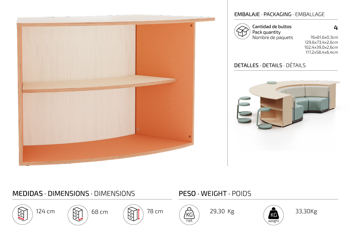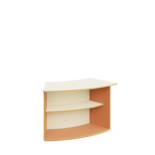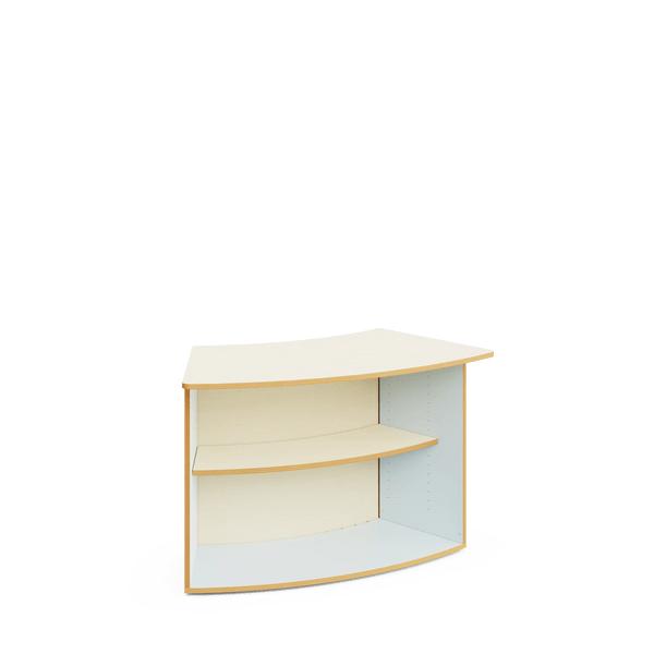 Armario escolar con estructura curva de 80 cm de altura y acabado en madera de arce. Dispone de dos espacios de almacenamiento y un estante interior regulable en altura. Ideal para equipar bibliotecas y aulas en centros educativos.