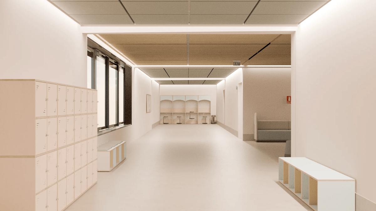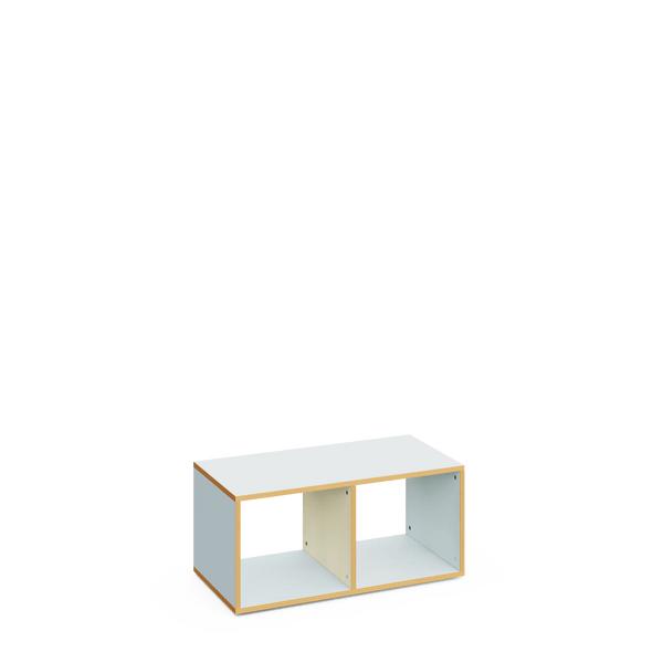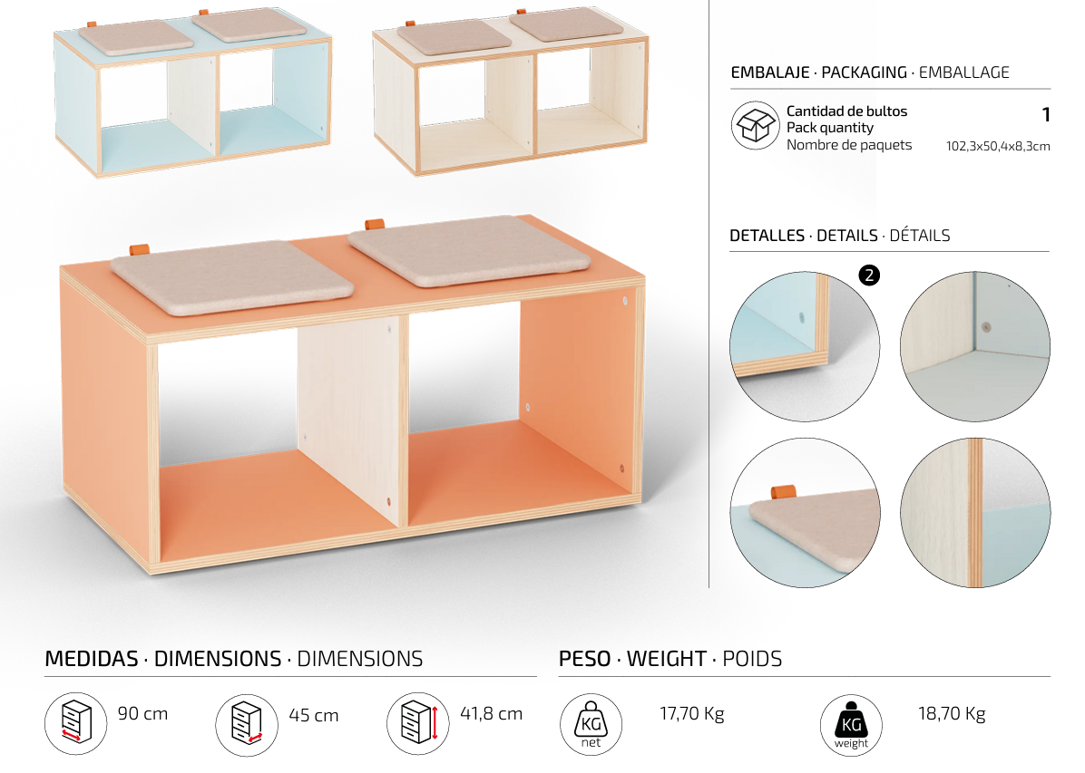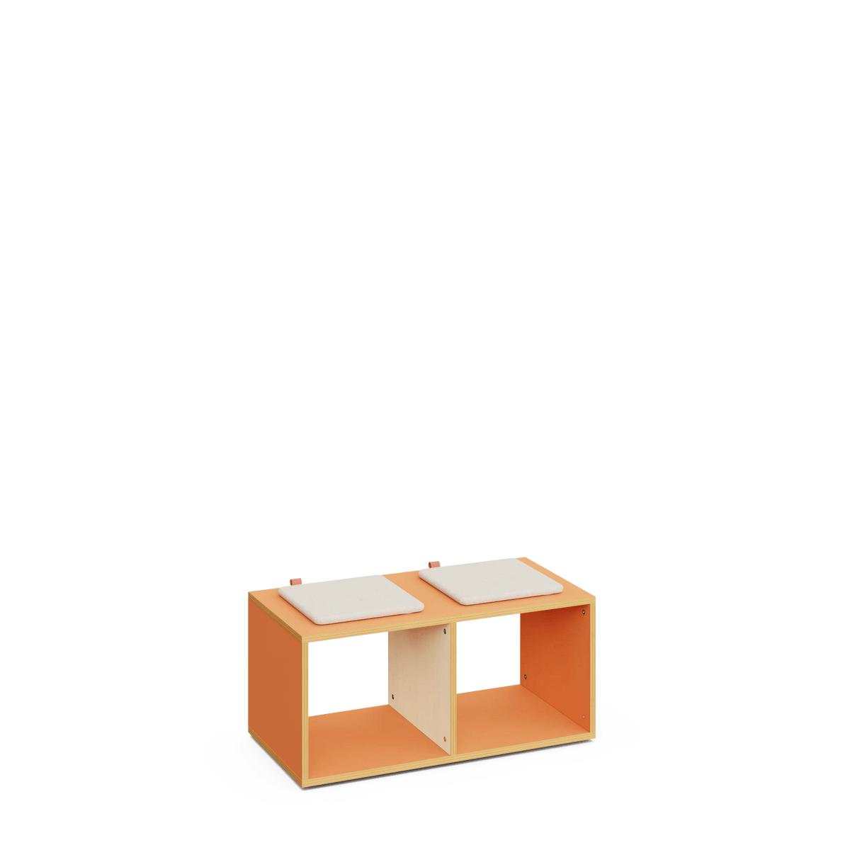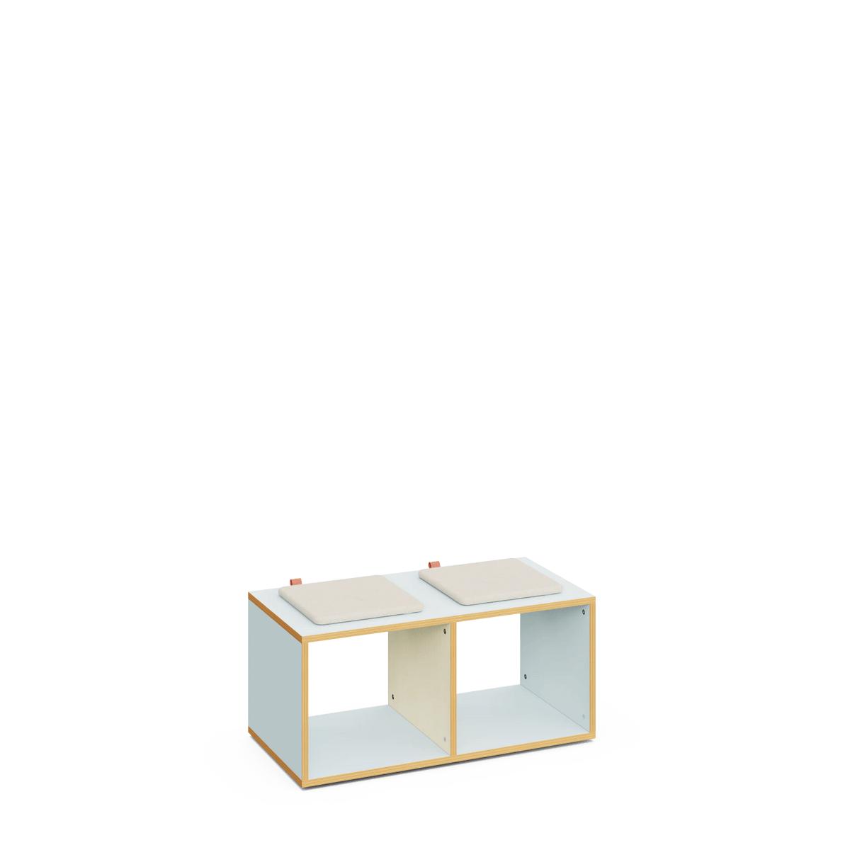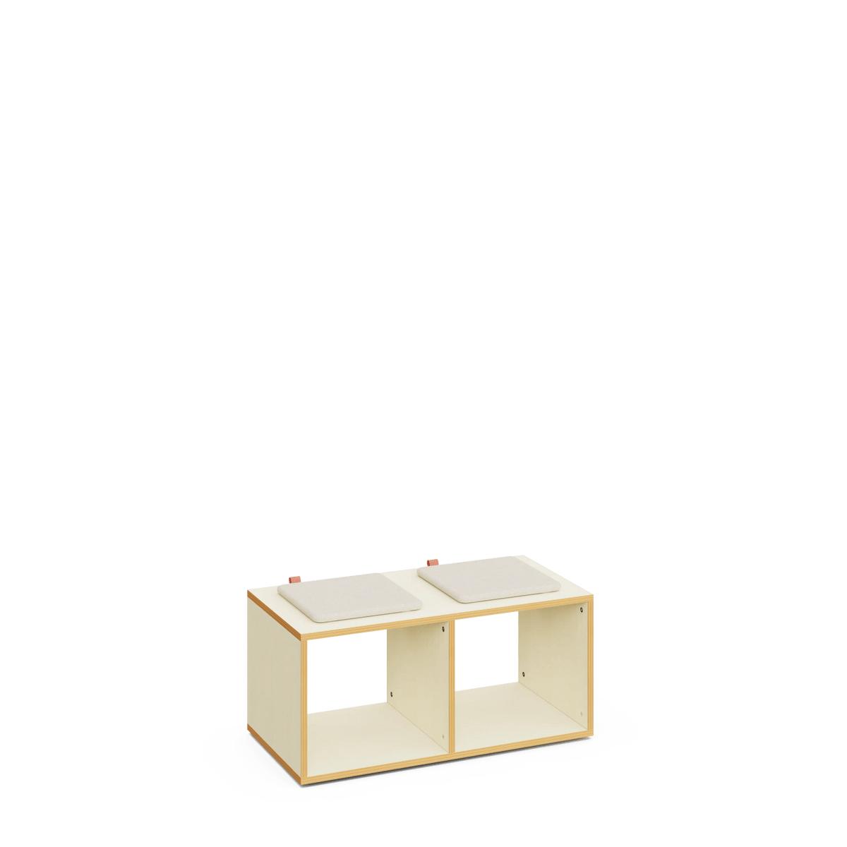 Banco escolar con almacenaje de 42 cm de altura, con acabado en madera de arce. Cuenta con dos compartimentos abiertos para almacenamiento. Ideal para equipar aulas y pasillos en centros educativos.