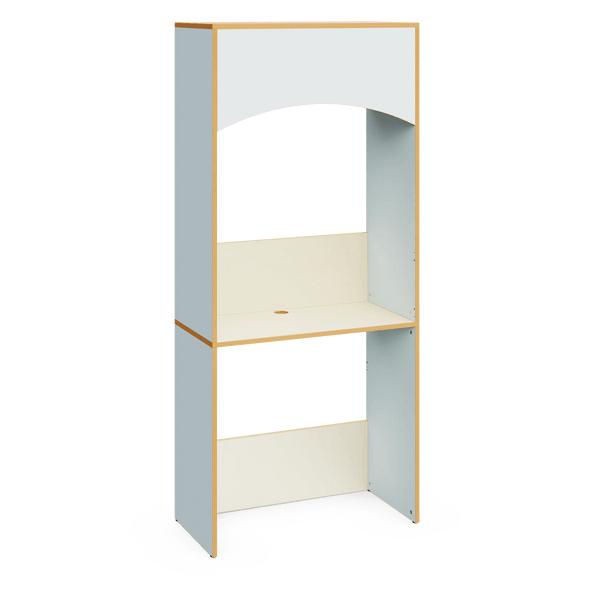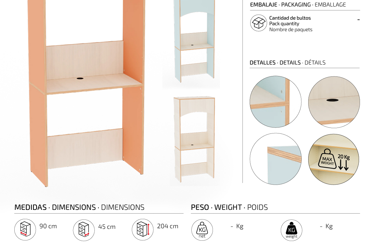 Cubículo de estudio individual de 204 cm de altura, con acabado en madera de arce. Incorpora un escritorio con pasacables integrado para mantener los dispositivos electrónicos organizados. Una solución práctica y estética, ideal para aulas, bibliotecas o pasillos de centros educativos.