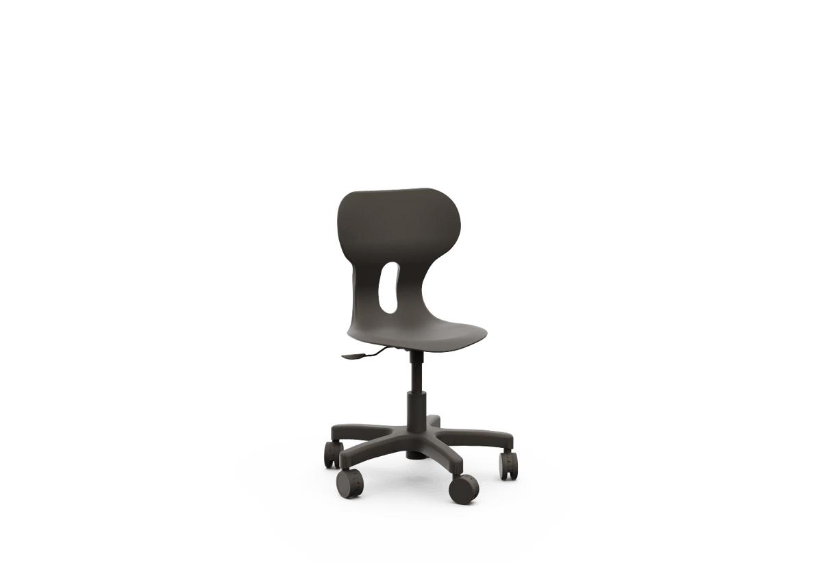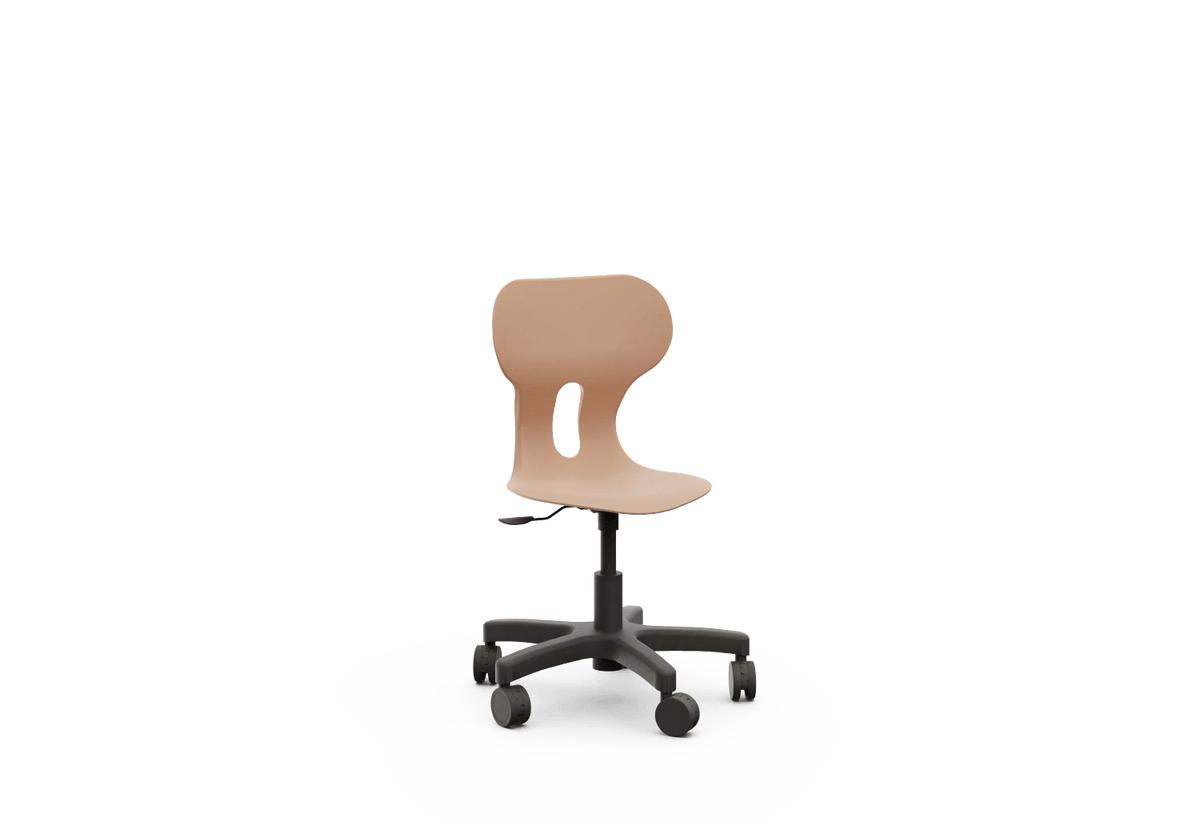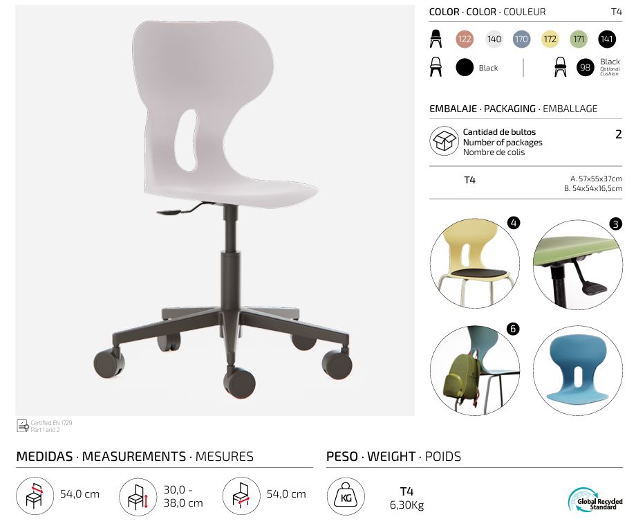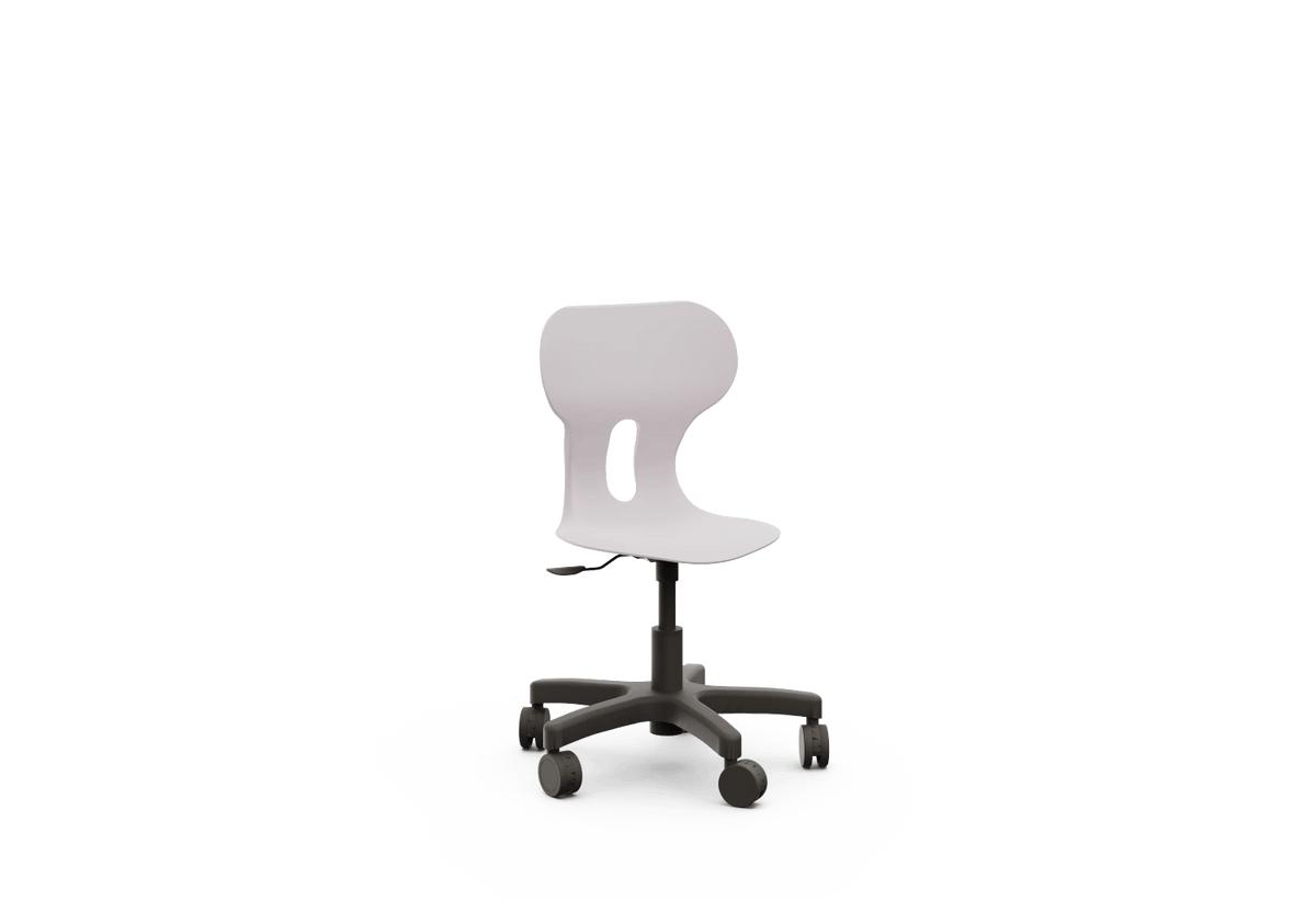 Silla giratoria escolar con ruedas y respaldo curvado para un confort óptimo. Fabricada en polipropileno reciclado, con base en forma de estrella y equipada con ruedas que aportan movilidad y versatilidad. Incorpora un agujero en la parte trasera del respaldo para colgar la mochila, facilitando el orden en el aula.