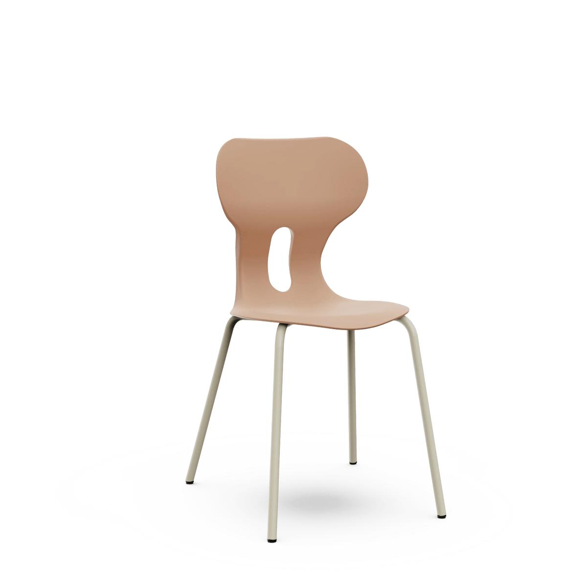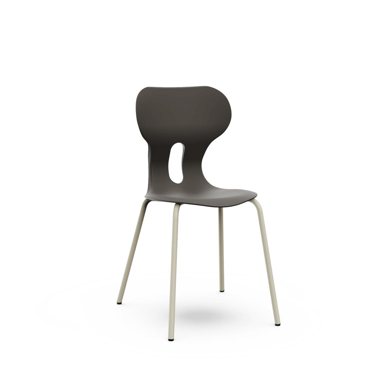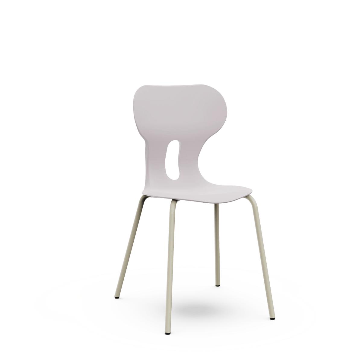 Silla escolar con respaldo curvado para un confort óptimo. Fabricada en polipropileno reciclado con estructura metálica de cuatro patas en color warm gray. Incorpora un agujero en la parte trasera del respaldo para colgar la mochila, facilitando el orden en el aula.