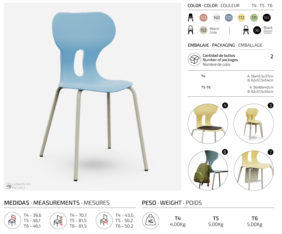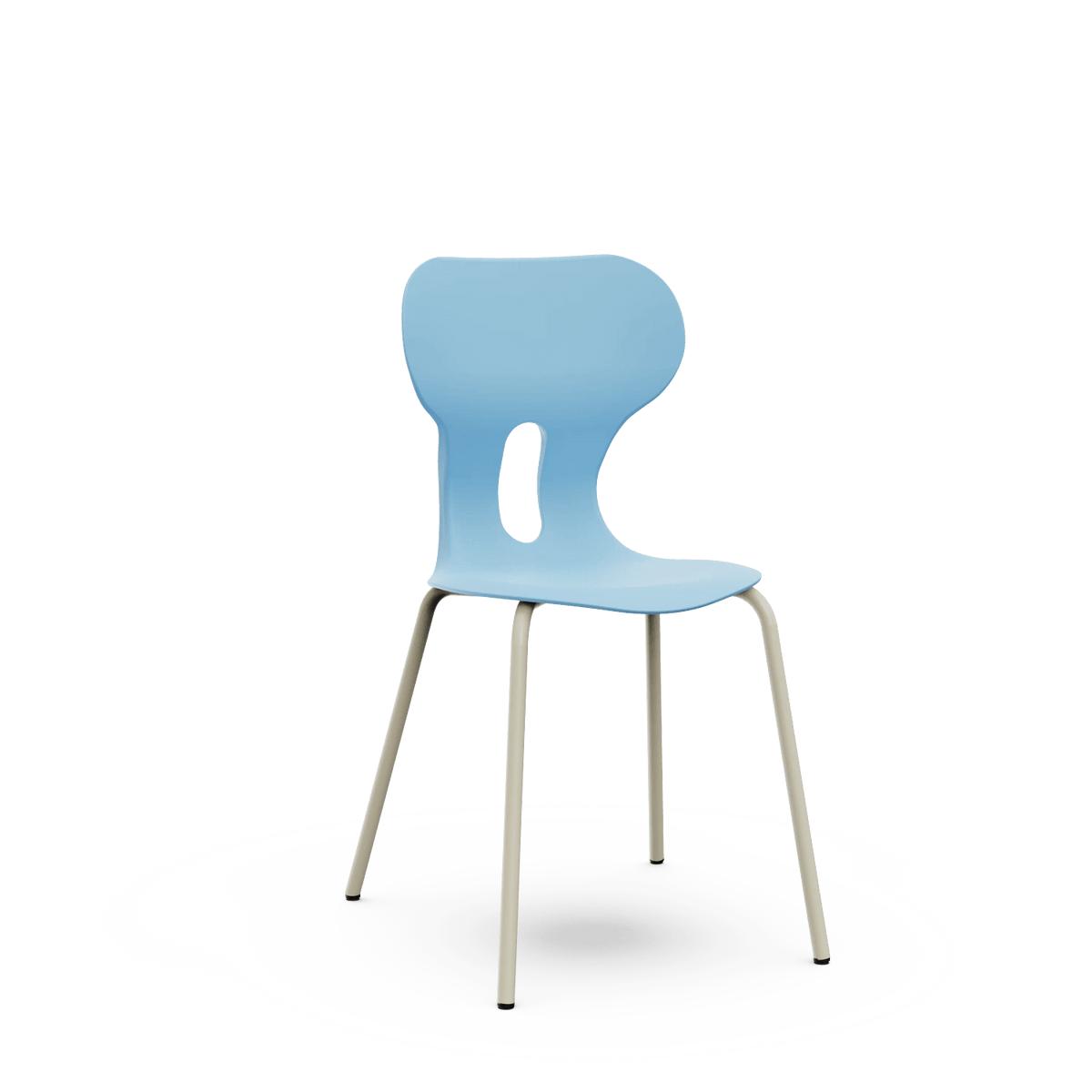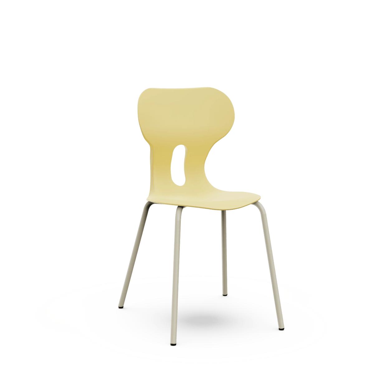 Silla escolar con respaldo curvado para un confort óptimo. Fabricada en polipropileno reciclado con estructura metálica de cuatro patas en color warm gray. Incorpora un agujero en la parte trasera del respaldo para colgar la mochila, facilitando el orden en el aula.
