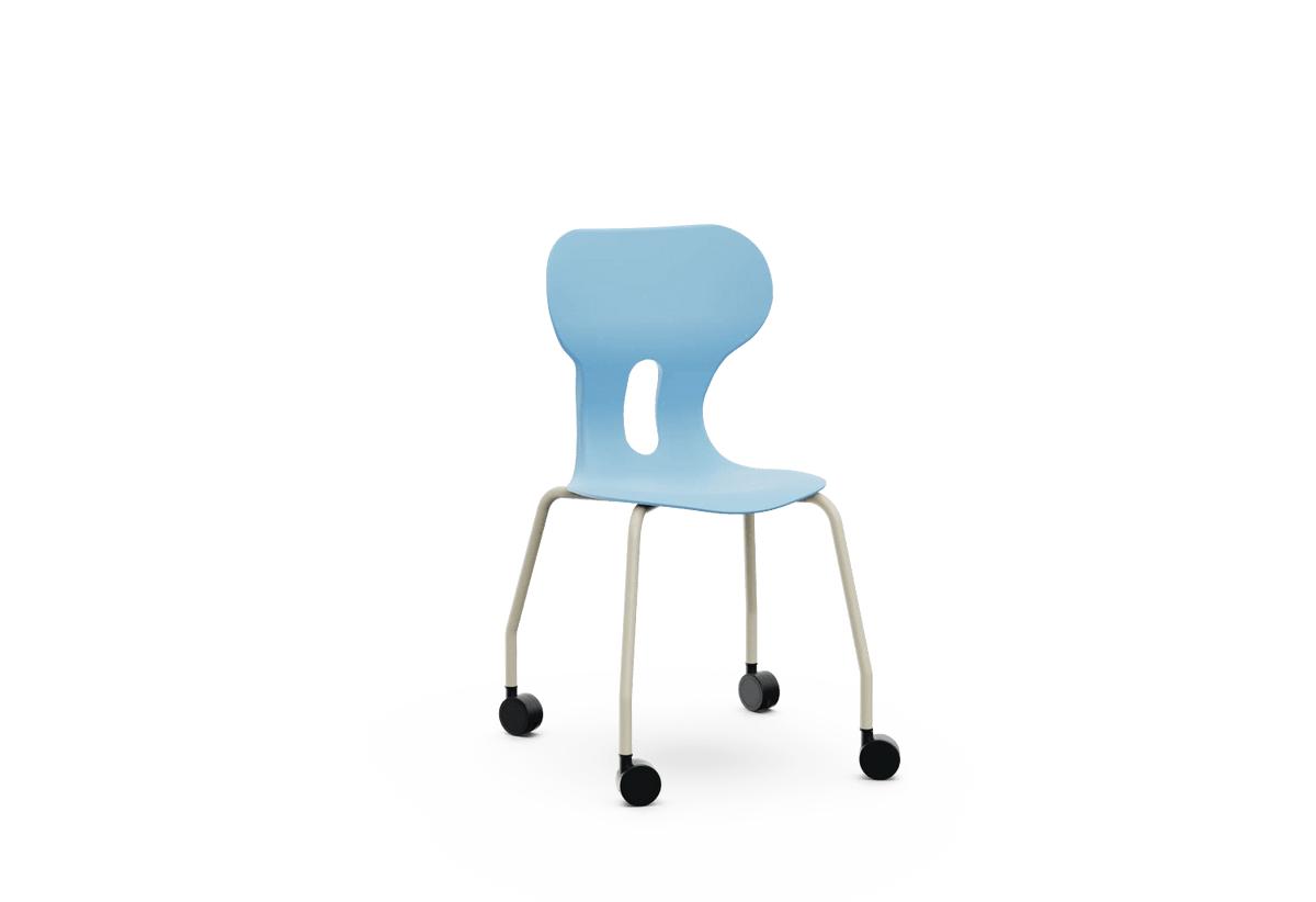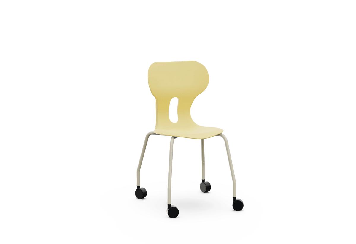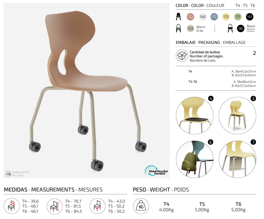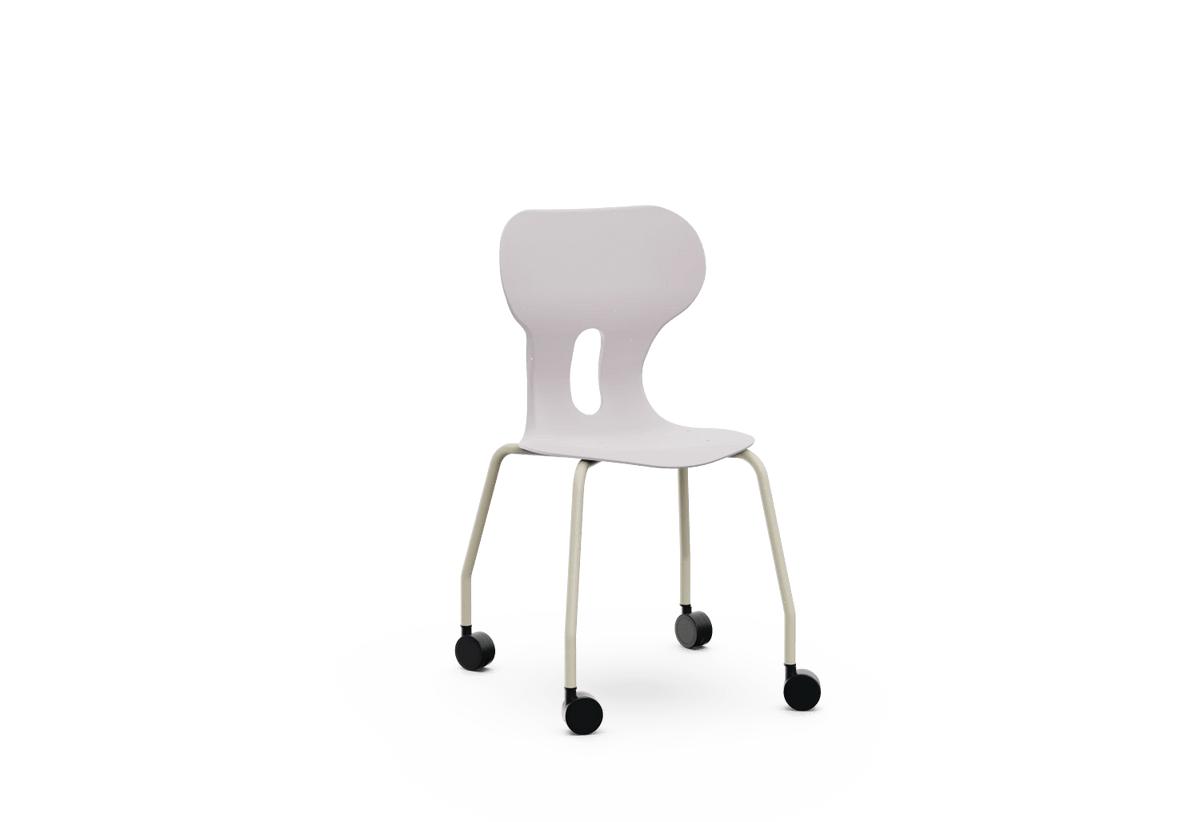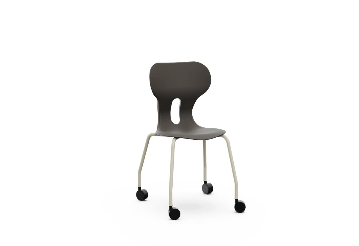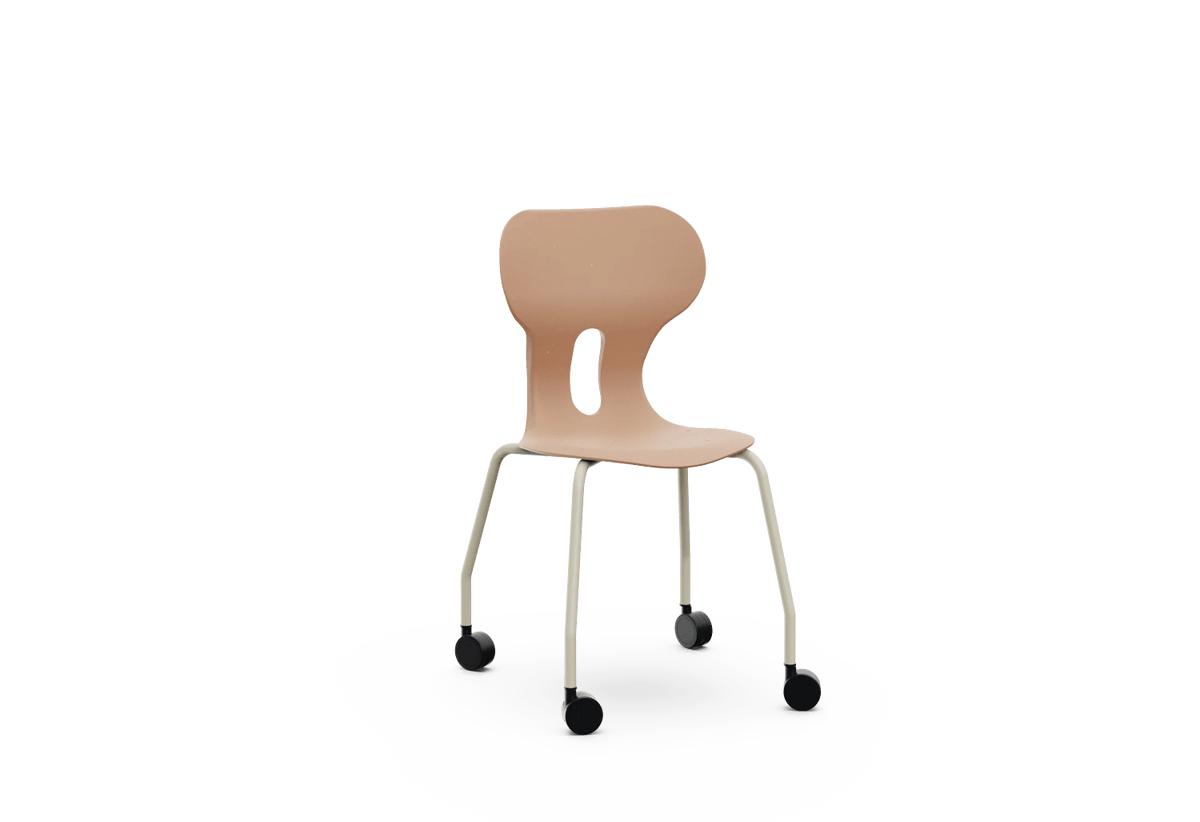 Silla escolar con ruedas y respaldo curvado para un confort óptimo. Fabricada en polipropileno reciclado, con estructura metálica en color warm gray y cuatro ruedas que aportan movilidad y versatilidad. Incorpora un agujero en la parte trasera del respaldo para colgar la mochila, facilitando el orden en el aula.