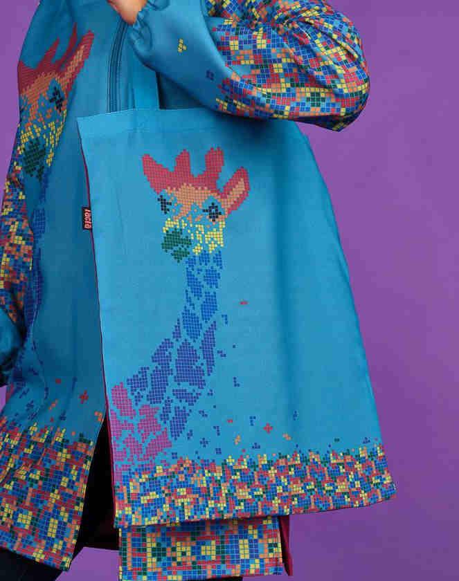 Bolsa maestra estampada con asas . Parte trasera lisa de color .