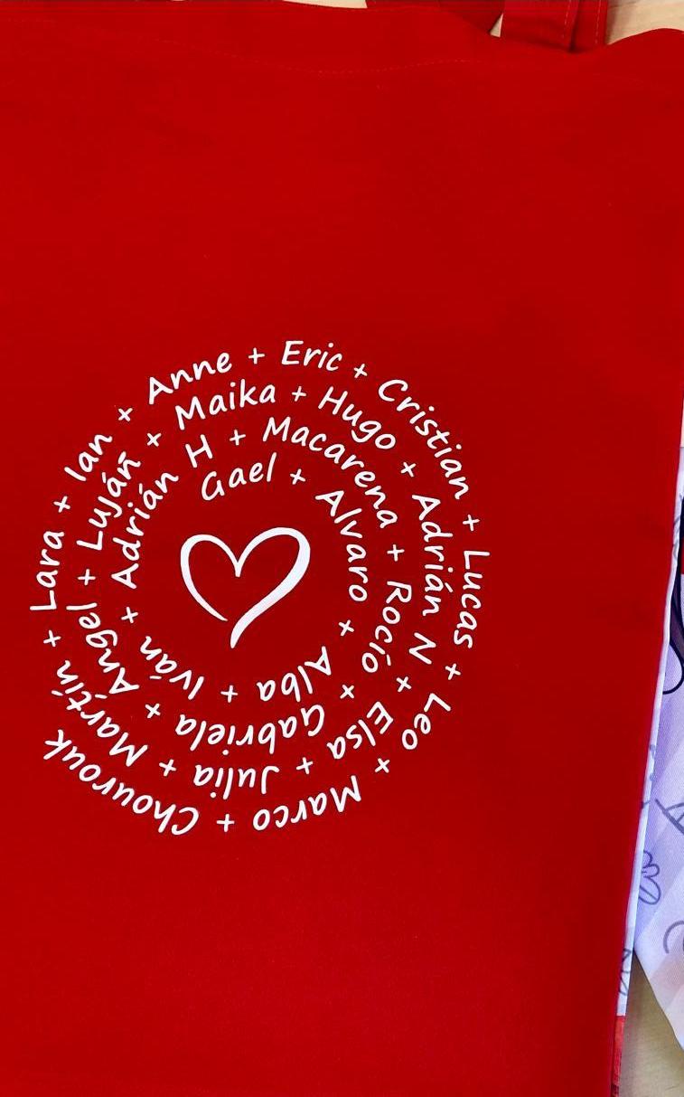 Bolsa maestra estampada con asas . Parte trasera lisa de color .