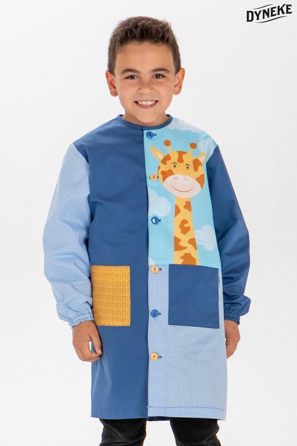 Bata infantil en color azul liso combinada con cuadrito azul y gracioso estampado jirafa en el canesú. Manga larga con puños elásticos. Dos bolsillos inferiores . Se abrocha con botones.