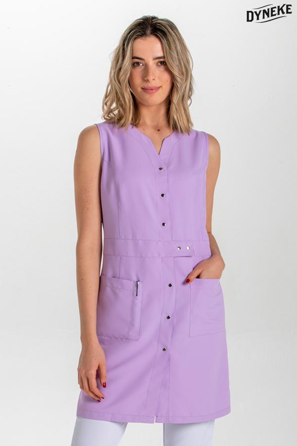Bata larga sin mangas en microfibra lila claro. Prenda entallada que se abrocha con corchetes y con detalle franja cinturón. Dos bolsillos inferiores y en uno de ellos tiene un ancho con pespunte para poner el bolígrafo. Largo: 90 cm. Tallaje: SP-P-M-G-SG-SSG-XG.Propuestas: centros de belleza, estética, spa, clínicas, comercios y dependencia en general.