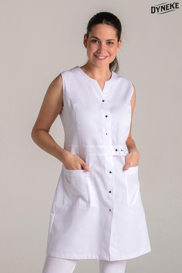 Bata larga sin mangas en microfibra blanca. Prenda entallada que se abrocha con corchetes y con detalle franja cinturón. Dos bolsillos inferiores y en uno de ellos tiene un ancho con pespunte para poner el bolígrafo. Largo: 90 cm. Tallaje: SP-P-M-G-SG-SSG-XG.Propuestas: centros de belleza, estética, spa, clínicas, comercios y dependencia en general.