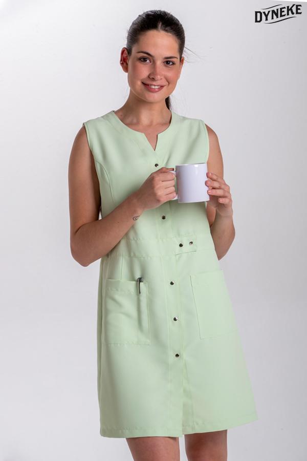 Bata larga sin mangas en microfibra verde. Prenda entallada que se abrocha con corchetes y con detalle franja cinturón. Dos bolsillos inferiores y en uno de ellos tiene un ancho con pespunte para poner el bolígrafo. Largo: 90 cm. Tallaje: SP-P-M-G-SG-SSG-XG.Propuestas: centros de belleza, estética, spa, clínicas, comercios y dependencia en general.