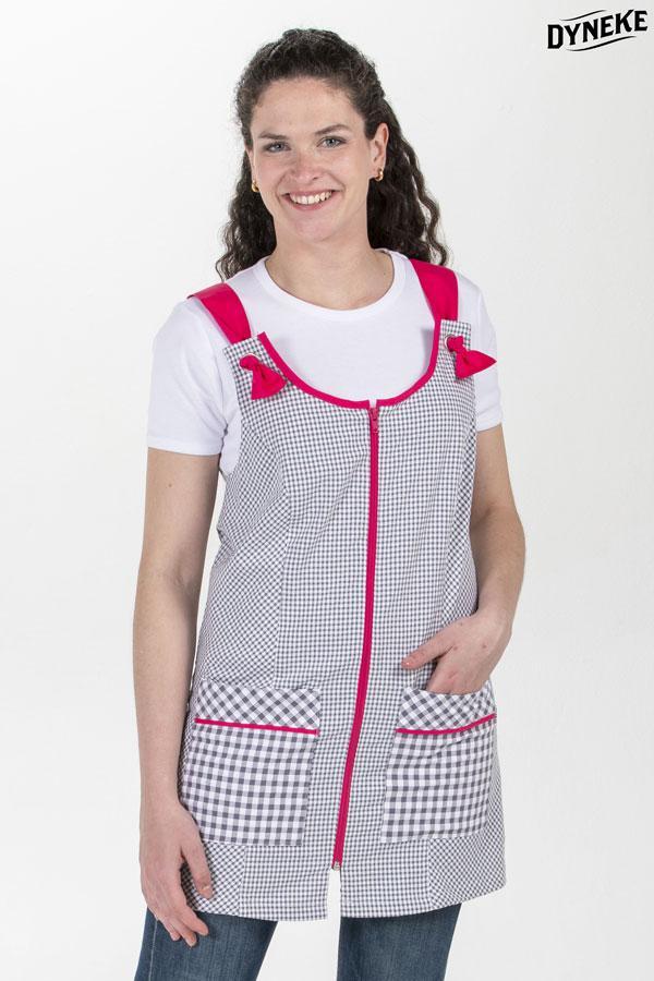 Pichi de maestra fabricado en tejido suave de cuadro gris con contraste fucsia en vivo cuello, bolsillos y tirantes. Ojales metálicos en tirantes regulables. Se abrocha con cremallera central en color fucsia.Dos bolsillos inferiores. Largo: 78 cm . Tallaje: SP-P-M-G-SG-SSG-XG.