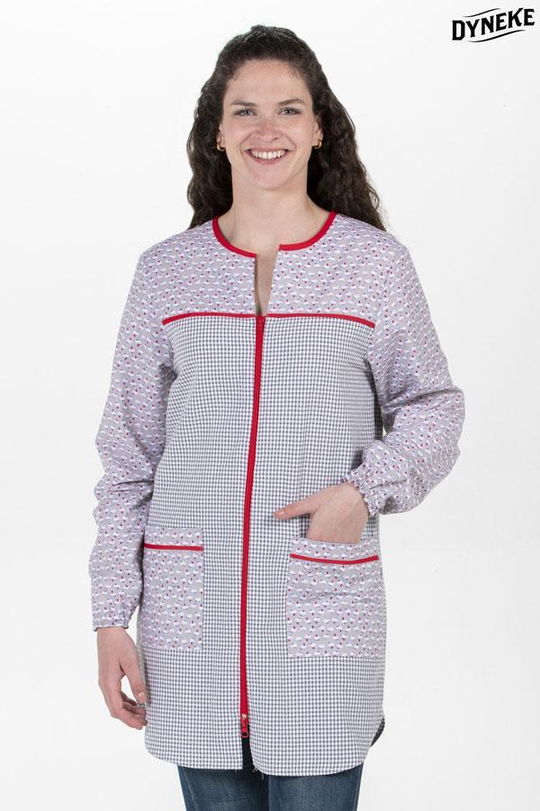 Bata de maestra en manga larga y puños elásticos. Fabricada en tejido suave de cuadritos grises combinado con tejido motivo pollitos en canesú y mangas. Vivos rojos en contraste en cuello , bolsillos y pecho. Se abrocha con cremallera roja de doble carro para mayor comodidad. Largo:82 cm. Tallaje: SP-P-M-G-SG-SSG-XG.