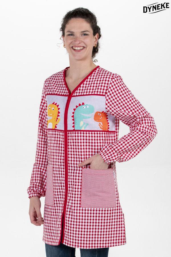 Bata de maestra en manga larga y cuello V. Puños elásticos. Fabricada en un tejido suave de cuadro rojo con estampado dinosaurios en canesú. Detalle vivo rojo. Se abrocha con cremallera . Dispone de dos amplios bolsillos. Aberturas laterales inferiores. Largo: 83 cm. Tallaje: SP-P-M-G-SG-SSG-XG. Propuestas: Batas maestra, guarderías, monitoras ,uso doméstico, jardín de infancia, infantil , primaria, ludotecas.