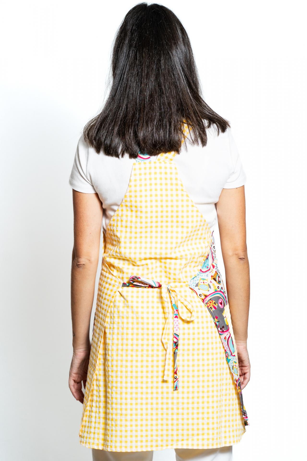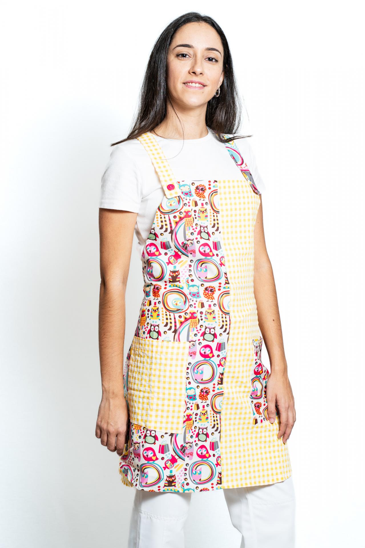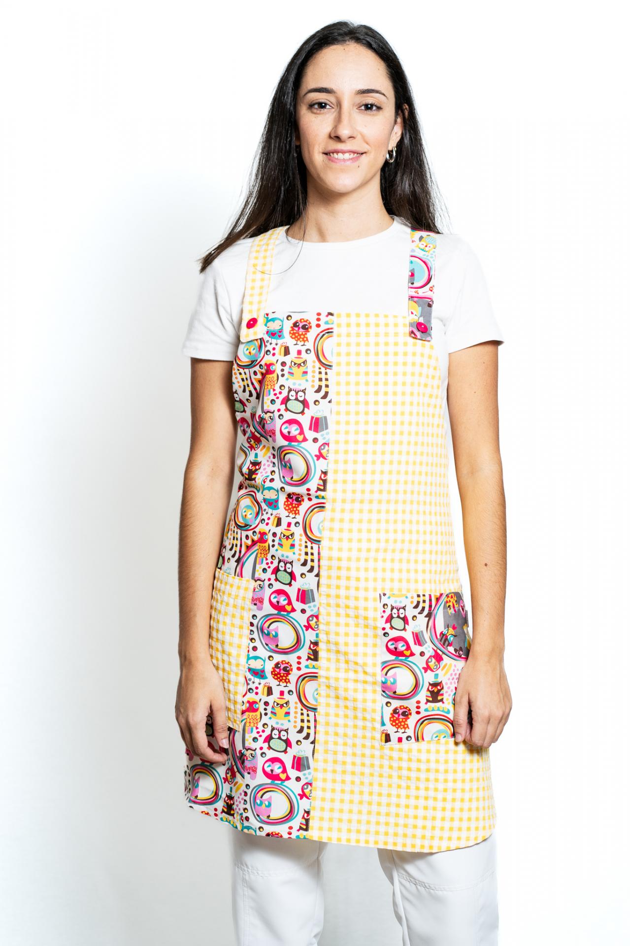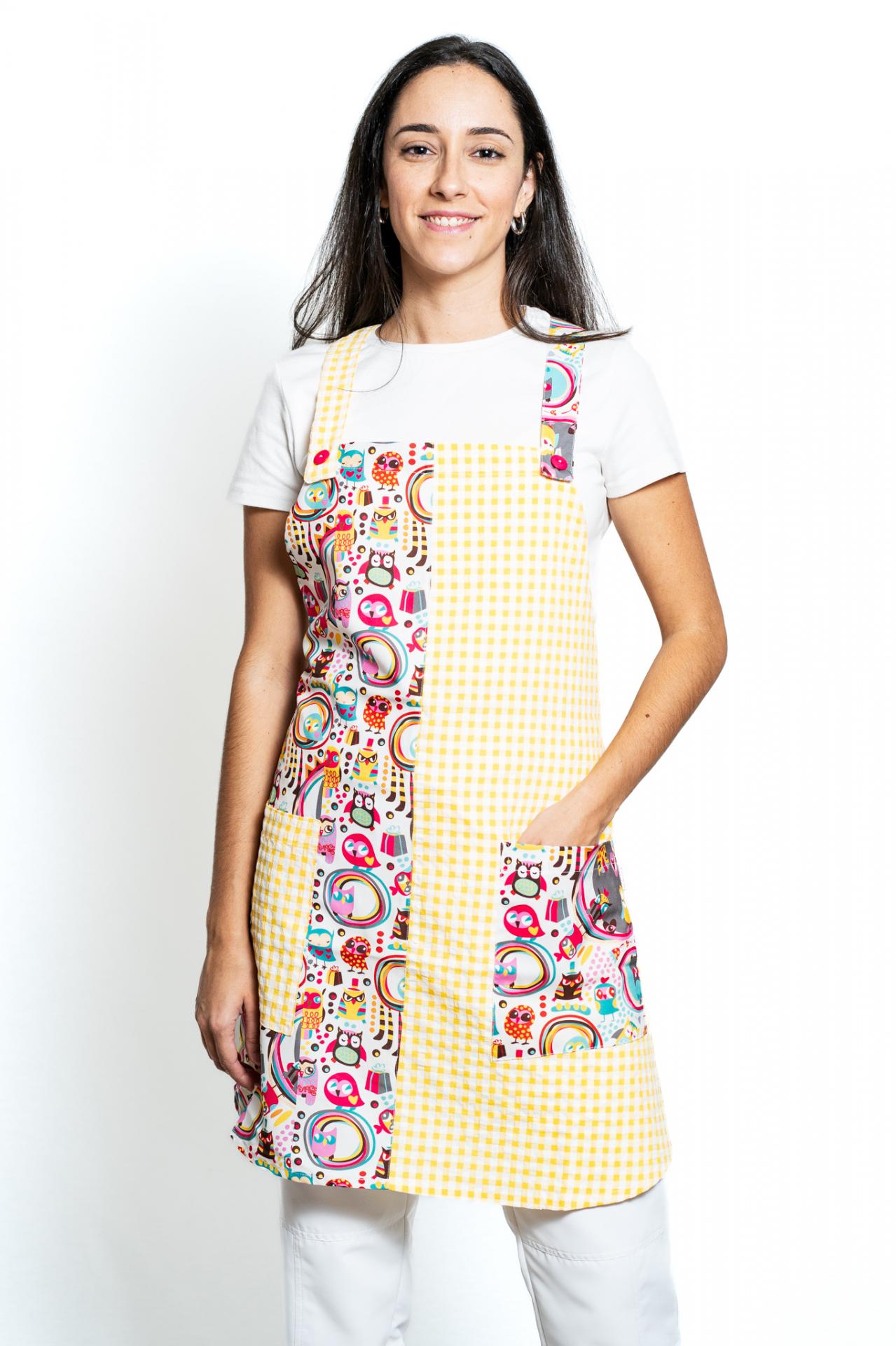 Cuadro delante y detrás combinado con tiras y bolsillo derecho y estampado delante y bolsillo.. Doble lazo delante y detrás. Talla única.