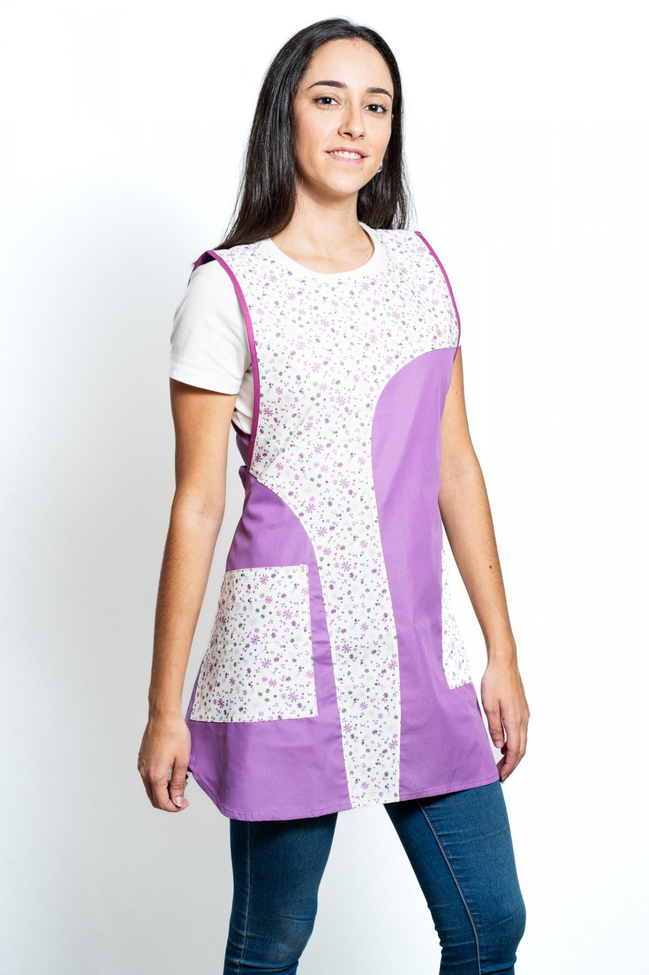 Estola que combina estampado de flor lila y liso lila. Doble bolsillo delantero. Atado delante y detrás.