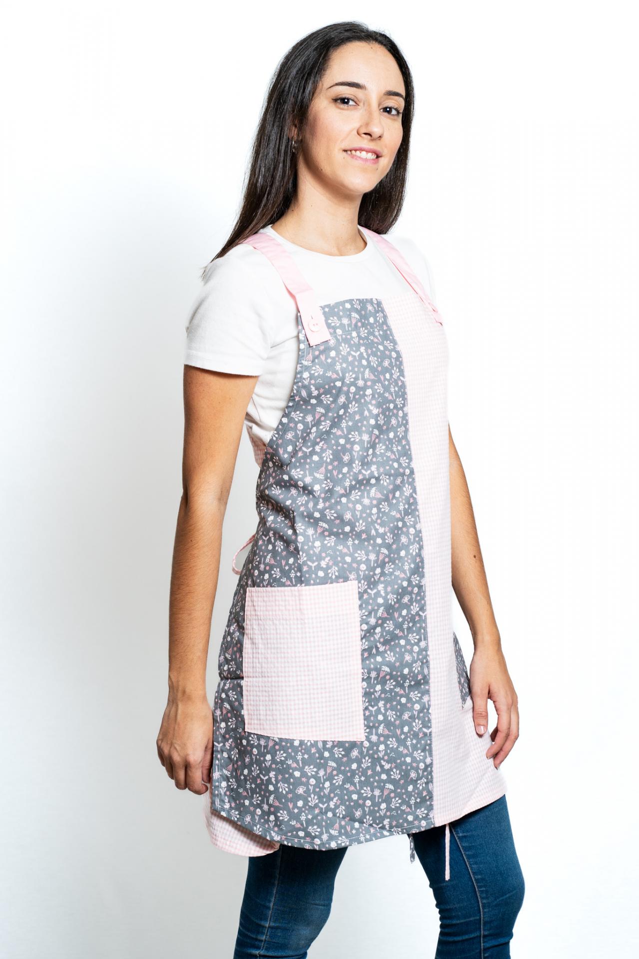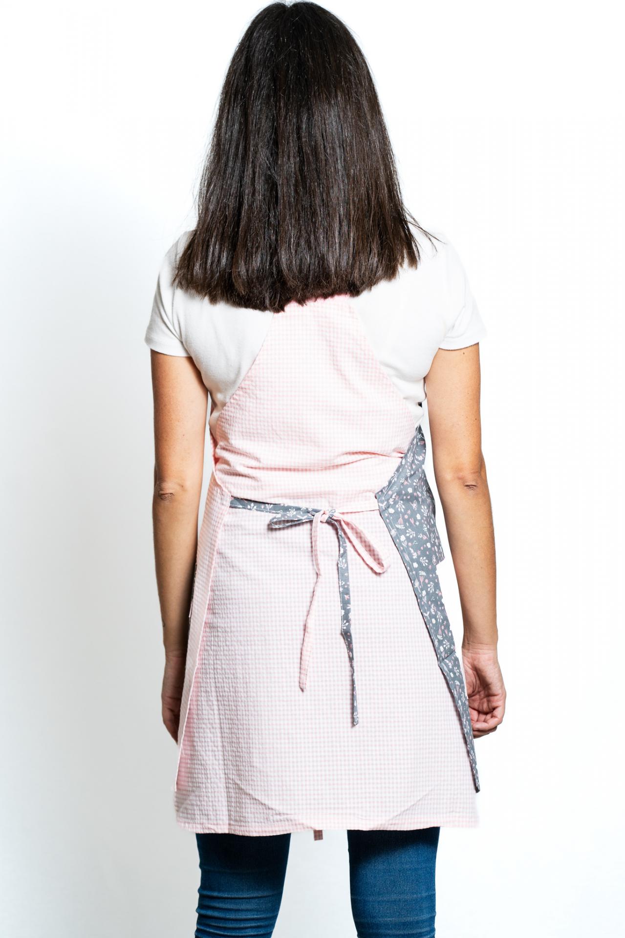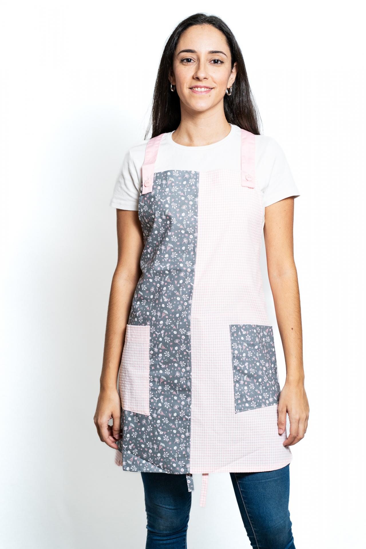 Cuadro delante y detrás combinado con tiras y bolsillo derecho y estampado delante y bolsillo.. Doble lazo delante y detrás. Talla única