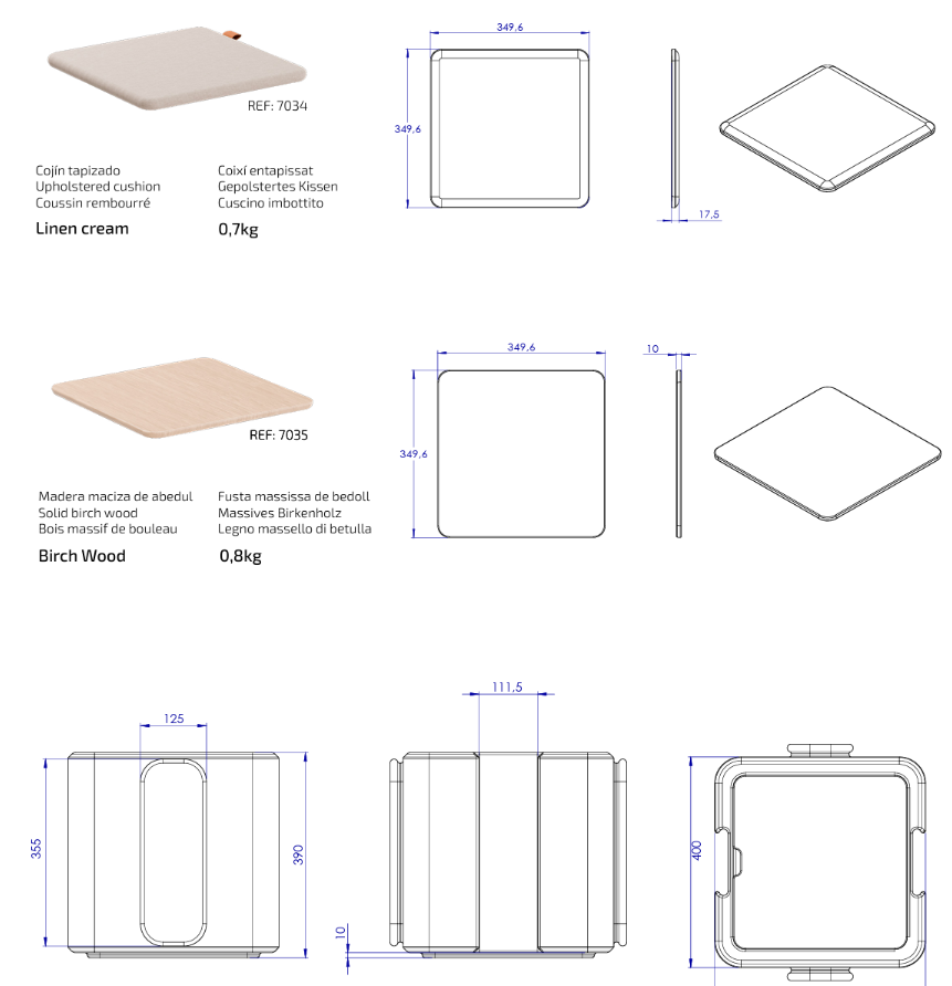 Ligero y ergonómico para facilitar el ensamblaje y el transporte. Uso interior y exterior. Cubierta superior acolchada o de madera (opcional).