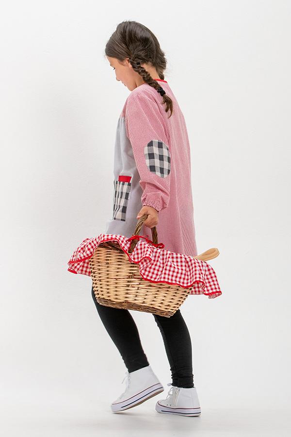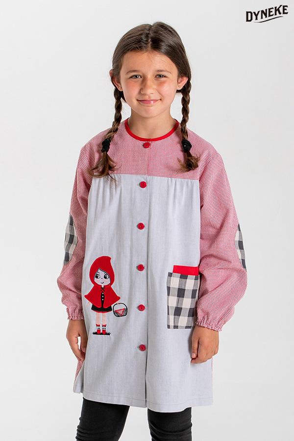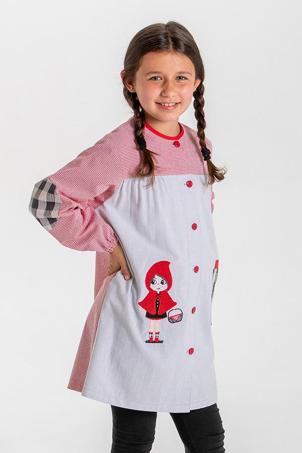 Bata infantil de niña en manga larga y puños de goma. Se abrocha con botones. Color gris combinado con cuadrito rojo en pecho, mangas y espalda. Contraste cuadro grande gris en coderas y bolsillo. Bolsillo doble superpuesto en un lado. Tiene un original bordado caperucita en fieltro rojo. Cinta en el cuello para colgar. Tallaje: de la T/1 a la T/8.Propuestas: jardín de infancia, guarderías, infantil, preescolar, comedores , fiestas infantiles.
