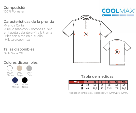 Características de la prenda-Manga Corta -Cuello mao con 2 botones al hilo en tapeta delantera y 1 a la trama