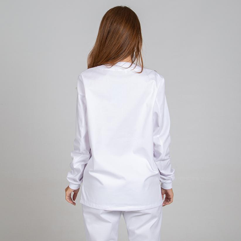 Este modelo especial para alimentación es unisex, de manga larga, con cuello pico, puños acrílicos y un bolsillo oculto en el pecho izquierdo cosido por el interior, ofreciendo un diseño funcional y práctico.