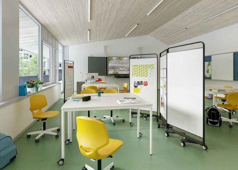 Utilizable por ambos lados con distintas superficies disponibles: pizarra blanca magnética, corcho.