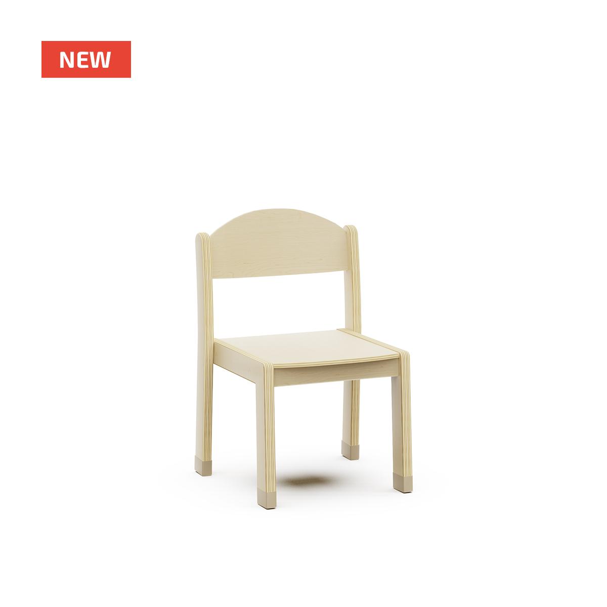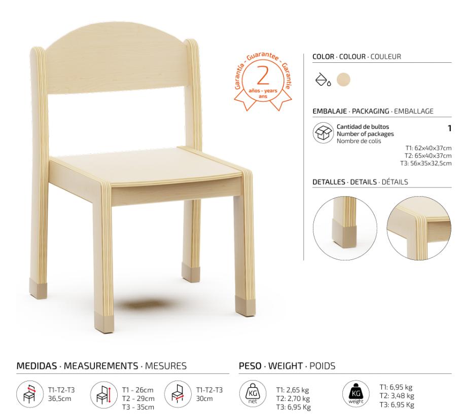 Silla escolar infantil fabricada en madera contrachapada de haya. Cuenta con respaldo y asiento moldeados que garantizan una correcta ergonomía. Las patas incorporan tapetas de plástico para proteger el suelo y reducir el ruido. Su diseño es ideal para aulas y espacios educativos en escuelas infantiles.