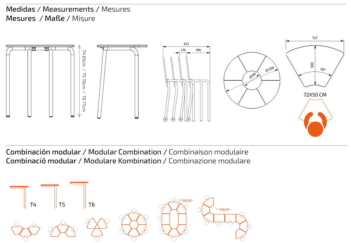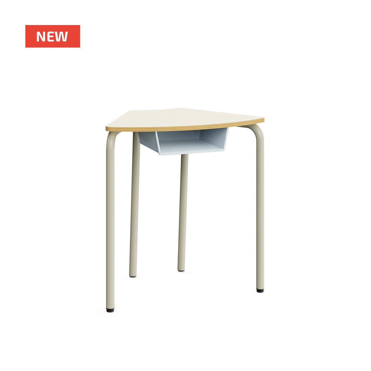 Pupitre escolar con estructura metálica y acabado en madera de arce. Su forma permite distintas combinaciones para trabajar en grupo o individualmente. Ideal para equipar aulas de aprendizaje cooperativo.