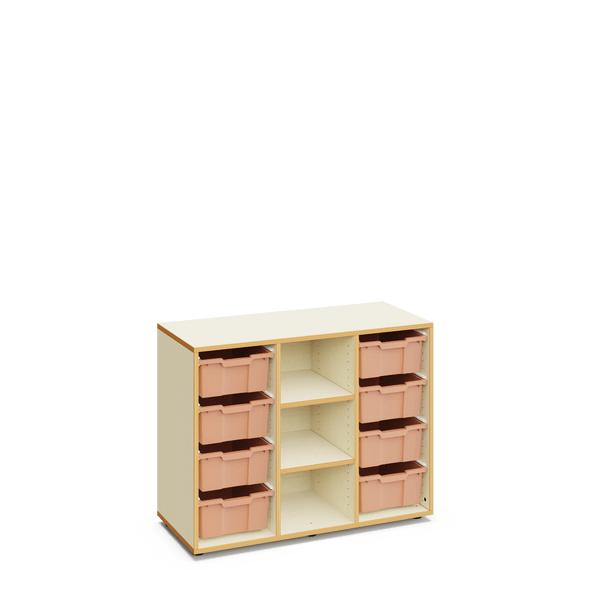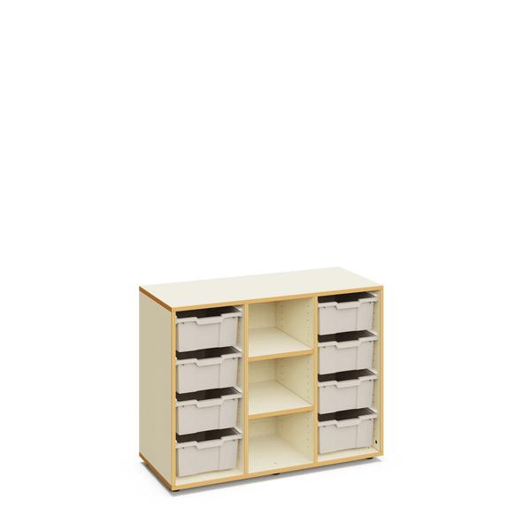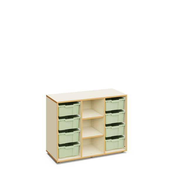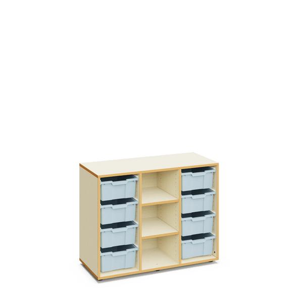Cuenta con dos secciones con cubetas y una sección central con estantes, ideal para organizar materiales en aulas de educación infantil o primaria.