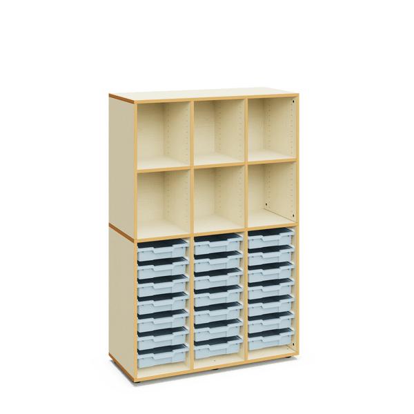 Armario escolar de 160 cm de altura, con acabado en madera de arce. Dispone de seis compartimentos abiertos en la parte superior y espacio de almacenamiento con cubetas en la parte inferior, ideal para organizar materiales en aulas de educación infantil o primaria.