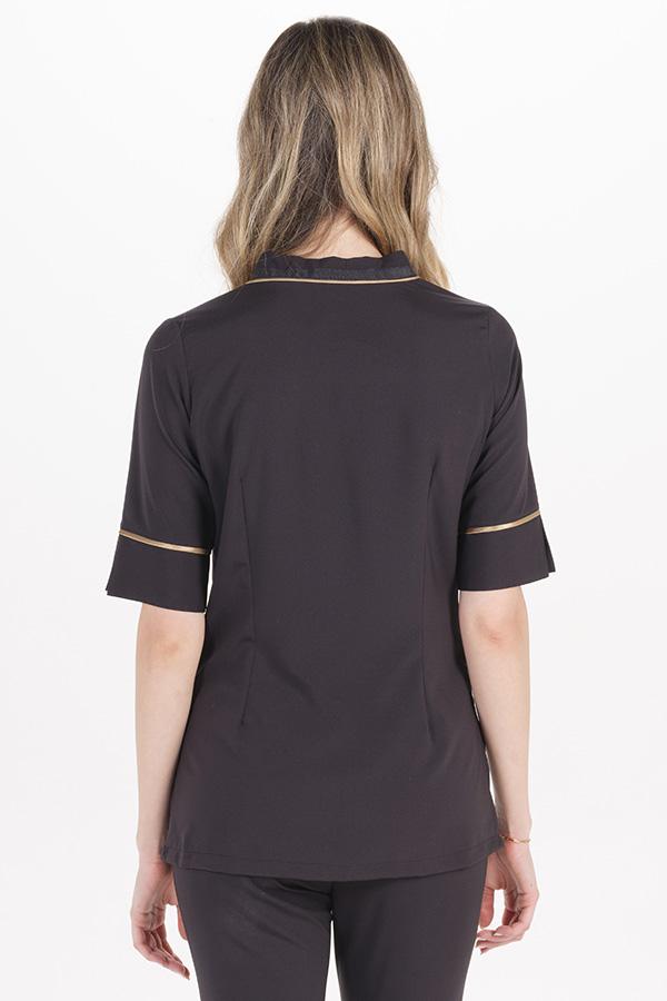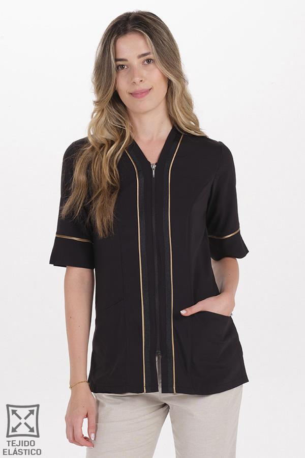 Chaqueta negra para estetica y spa. Cuello pico y manga 3/4 con vivo dorado y abertura. Prenda entallada muy elegante fabricada en microfibra negra elástica con detalle vivo dorado y cinta negra otomán y raso en la linea del cuello y cremallera. La cremallera es de malla invertida que evita el deterioro por rozamiento. Dispone de dos bolsillos inferiores. Aberturas lateralesinferiores para mayor comodidad. Largo: 69 cm. Tallaje: SP-P-M-G-SG-SSG-XG. Propuestas: comercio, centros de estética , spa, fisio, hoteles.