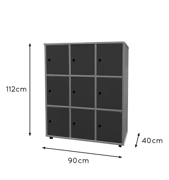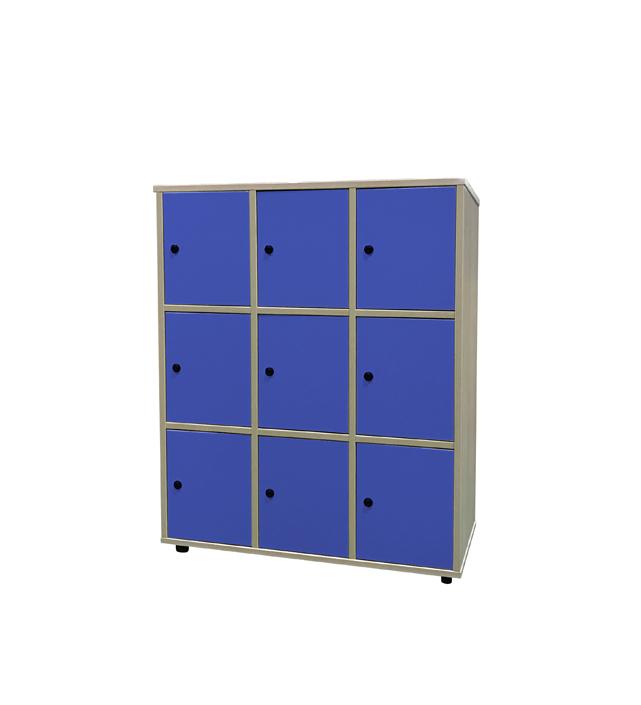 Taquilla con 9 puertas y cerraduras desiguales amaestradas. Fabricado en melamina de haya de 19 mm de grosor, excepto trasera de 10 mm, puertas de 16 mm y cantos de PVC de 2 mm, acabado por las dos caras. Pies niveladores de PVC de 4 cm de diámetro y 4 cm de altura, para evitar la humedad y desniveles que pueda tener el suelo. Estos pies pueden ser retirados para poder superponer diferentes armarios. PUERTAS INTERIORES ANTIATRAPAMIENTO DE DEDOS EN SU CIERRE y tiradores de polímero suave (goma) (antigolpes).