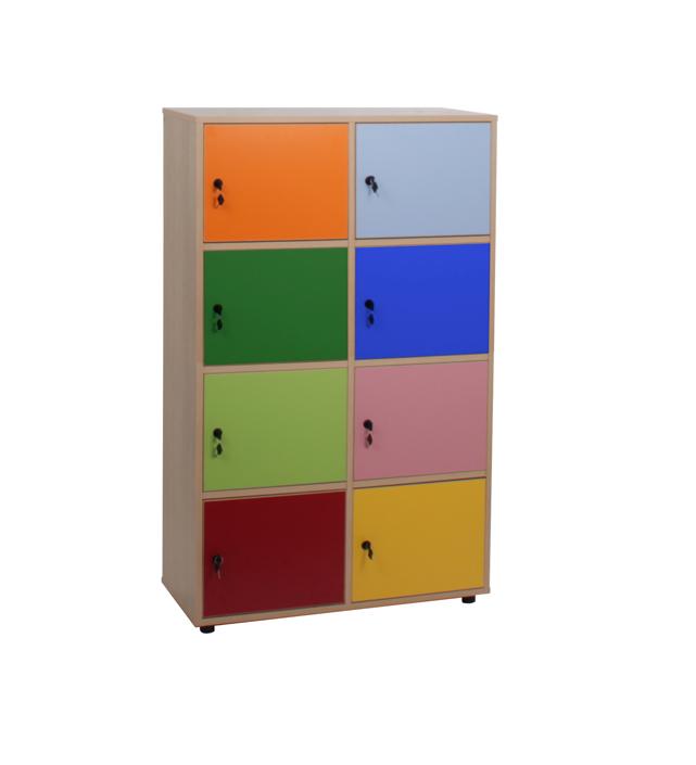 Taquilla con 8 puertas y cerraduras desiguales amaestradas. Fabricado en melamina de haya de 19 mm de grosor, excepto trasera de 10 mm, puertas de 16 mm y cantos de PVC de 2 mm, acabado por las dos caras. Pies niveladores de PVC de 4 cm de diámetro y 4 cm de altura, para evitar la humedad y desniveles que pueda tener el suelo. Estos pies pueden ser retirados para poder superponer diferentes armarios. PUERTAS INTERIORES ANTIATRAPAMIENTO DE DEDOS EN SU CIERRE y tiradores de polímero suave (goma) (antigolpes).