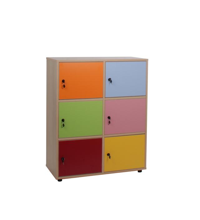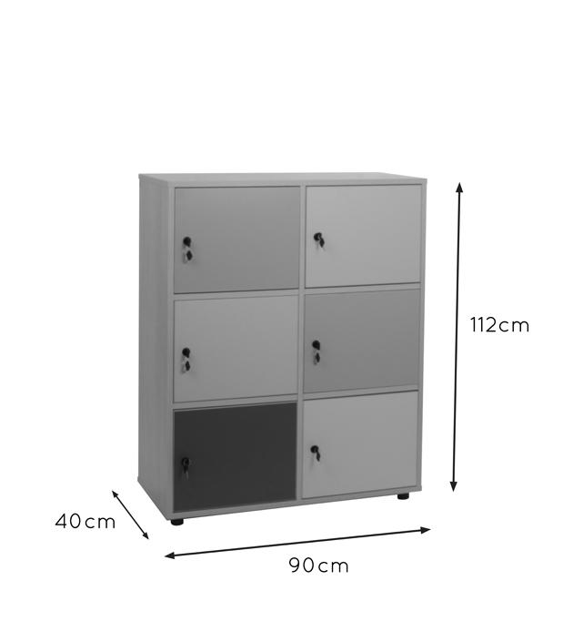 Taquilla con 6 puertas y cerraduras desiguales amaestradas. Fabricado en melamina de haya de 19 mm de grosor, excepto trasera de 10 mm, puertas de 16 mm y cantos de PVC de 2 mm, acabado por las dos caras. Pies niveladores de PVC de 4 cm de diámetro y 4 cm de altura, para evitar la humedad y desniveles que pueda tener el suelo. Estos pies pueden ser retirados para poder superponer diferentes armarios. PUERTAS INTERIORES ANTIATRAPAMIENTO DE DEDOS EN SU CIERRE y tiradores de polímero suave (goma) (antigolpes).