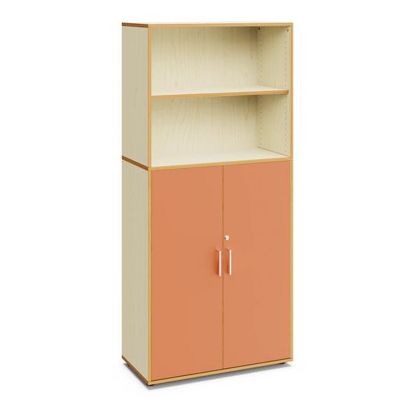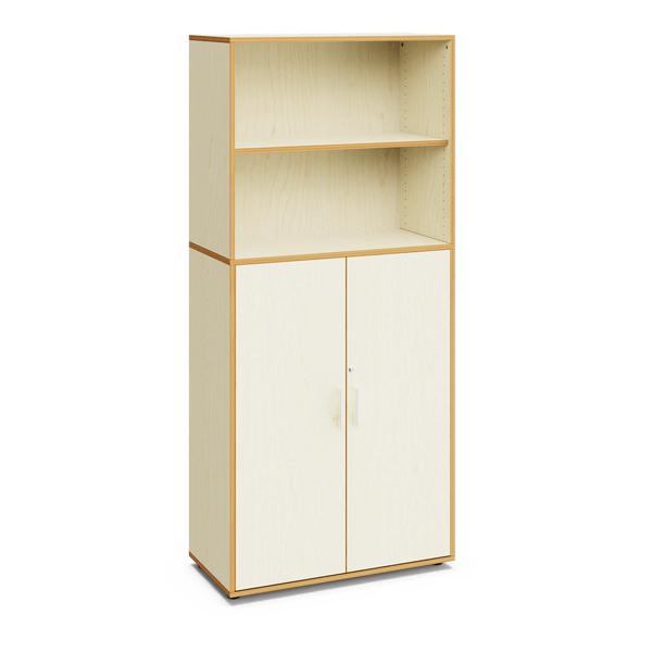 Armario escolar de 200 cm de altura, con acabado en madera de arce. Cuenta con dos compartimentos abiertos en la parte superior y dos puertas con espacios de almacenamiento en la parte inferior. Ideal para equipar aulas en centros educativos.