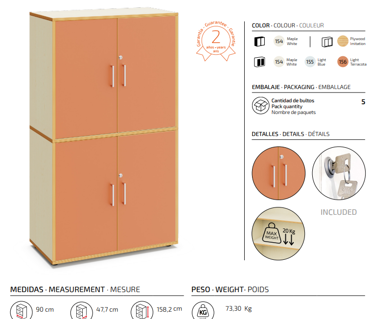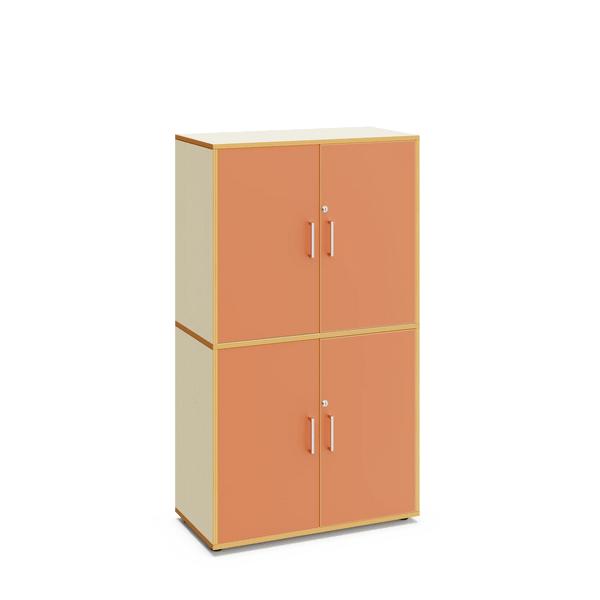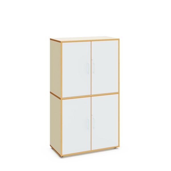 Armario escolar de 160 cm de altura, con acabado en madera de arce. Dispone de cuatro puertas y espacios interiores para almacenamiento. Ideal para equipar aulas en centros educativos.