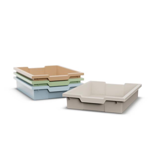 Cubeta pequeña de plástico con alas reforzadas. Ideal como complemento para aulas de aprendizaje cooperativo o para su uso en armarios escolares. Su base cuenta con líneas en relieve que reducen la fricción sobre las superficies de trabajo. La parte frontal tiene un diseño especial que facilita la extracción de la bandeja, además de topes que evitan que se empuje hacia el interior.