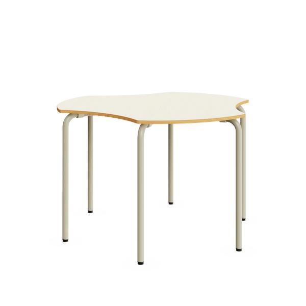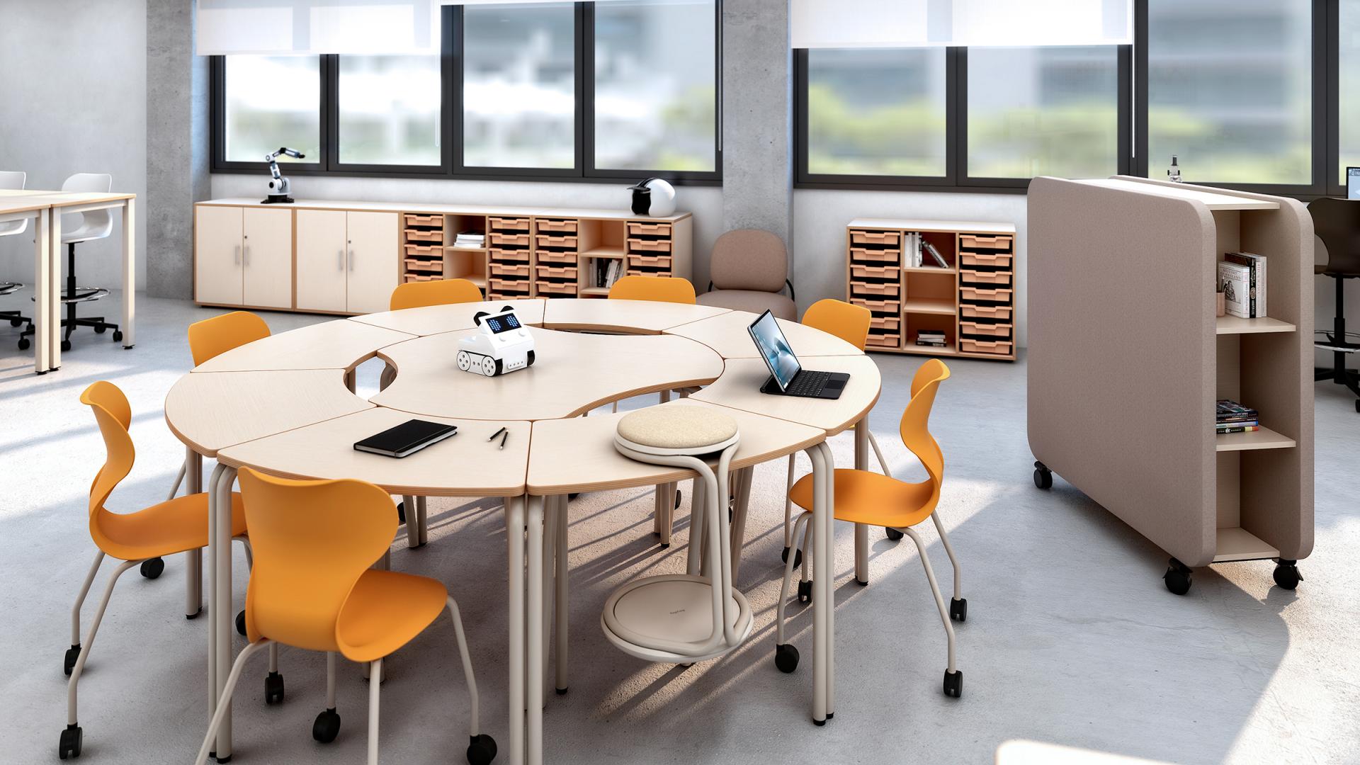 Mesa escolar con estructura metálica y acabado en madera de arce que permite distintas combinaciones para trabajar en grupo o individualmente. Ideal para equipar aulas de aprendizaje cooperativo.