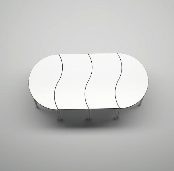 Mesa escolar con estructura metálica y sobre de mesa en madera de arce o acabado blanco. Modular y combinable entre sí, permite diversas configuraciones para trabajar en grupo o de forma individual. Ideal para equipar aulas de aprendizaje cooperativo.