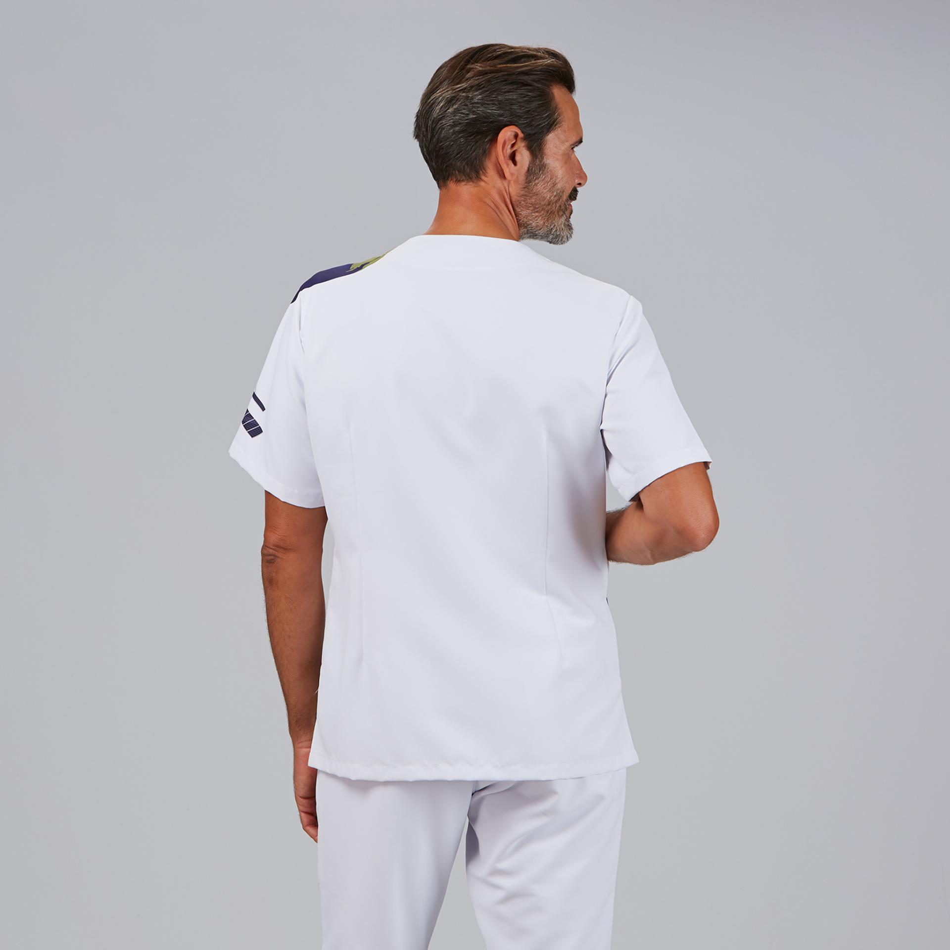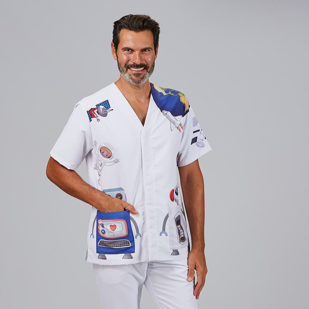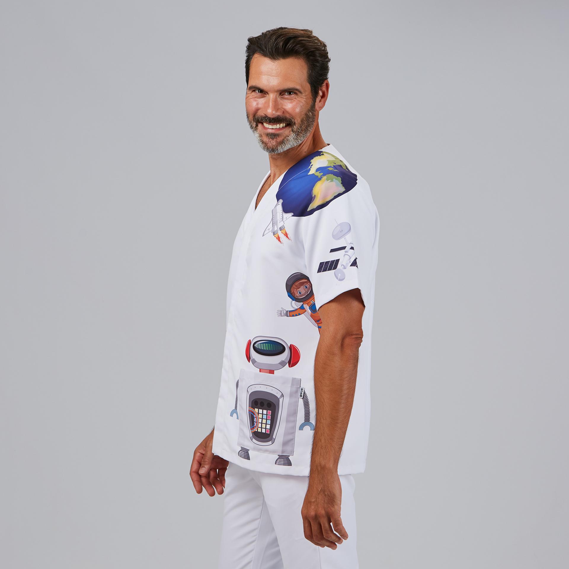 Blusa Unisex Amaia Astronauta, diseñada para profesionales de la salud y aquellos en la industria de la alimentación. Esta prenda de manga corta presenta un elegante cuello pico y un cierre discreto mediante botones de presión ocultos, combinando funcionalidad y estilo. La holgada blusa incluye dos bolsillos de parche delanteros y aberturas laterales para un ajuste cómodo y ventilación adicional.