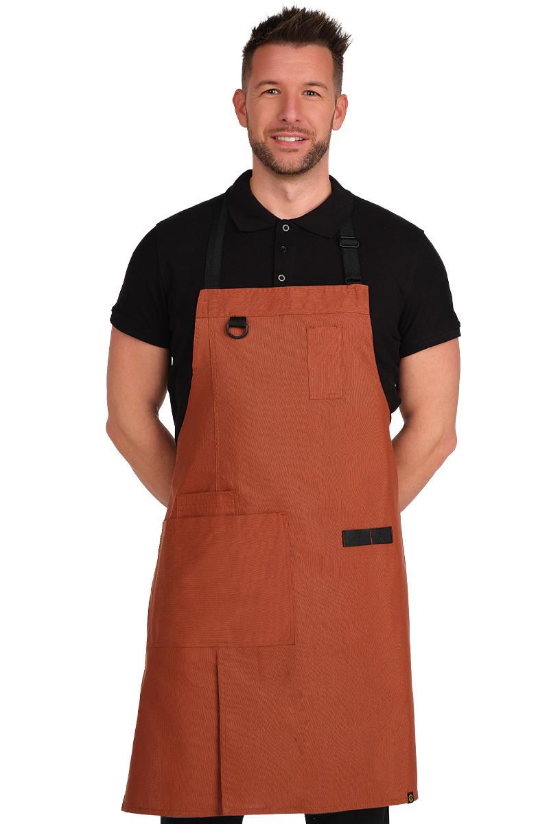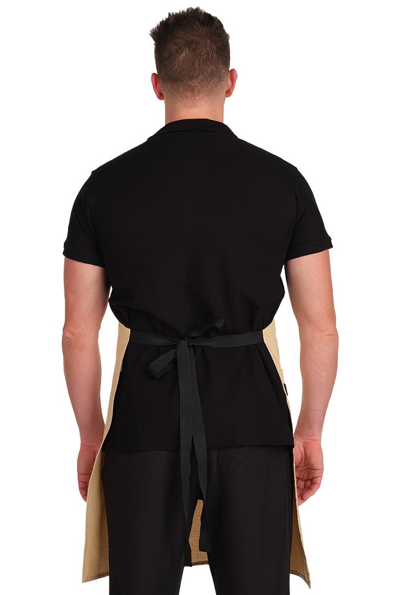 Delantal disponible en tonos teja o beige, su diseño liso se ve realzado por el contraste de sus atadores en color negro, creando una apariencia moderna que se aleja de lo convencional para ofrecer un aire de sofisticación técnica.
