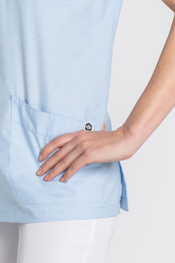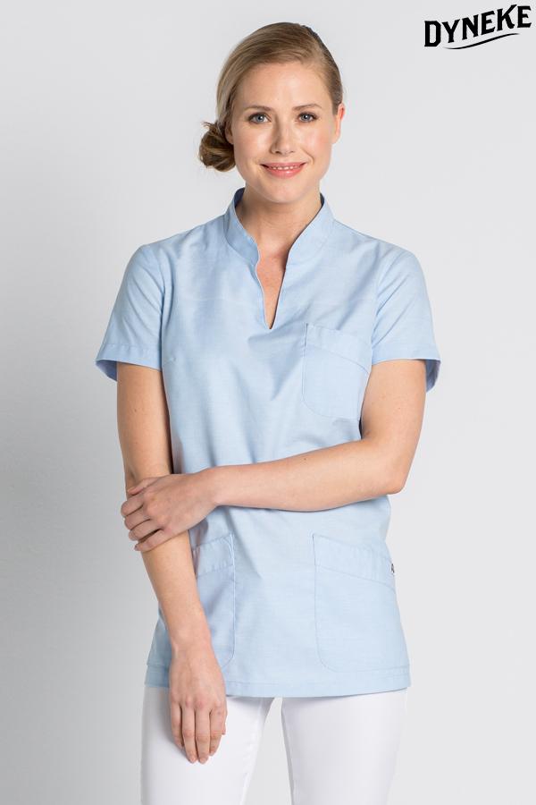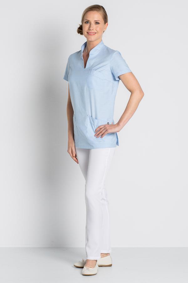 Casaca sanitaria de manga corta con cuello mao y cortes laterales en la parte inferior de la prenda.