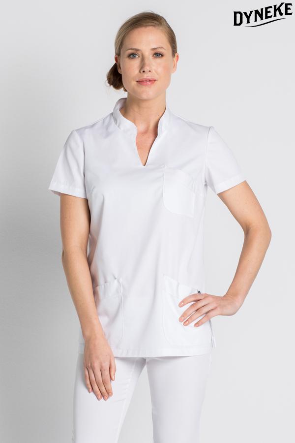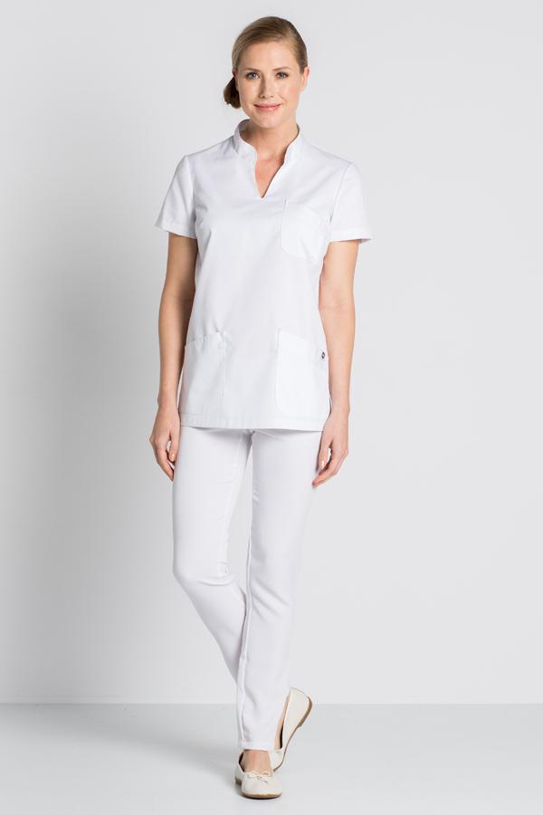 Casaca sanitaria de manga corta con cuello mao y cortes laterales en la parte inferior de la prenda.