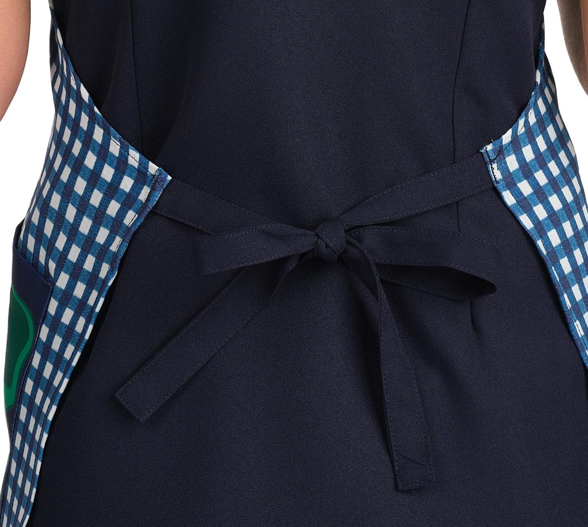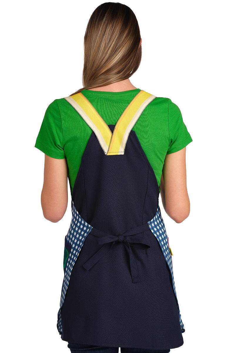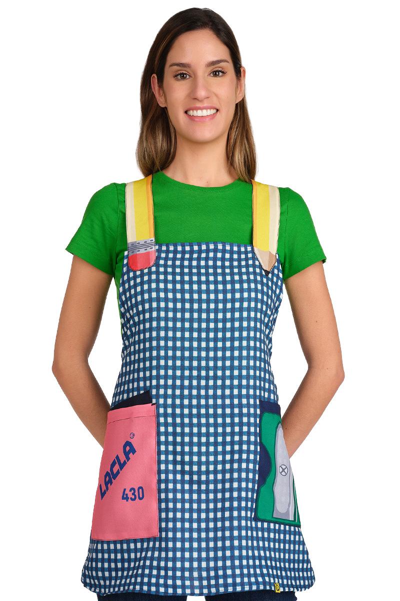 Confeccionada en tejido de bambula a cuadros azules y blancos, ofrece una textura ligera, de alta durabilidad y fácil lavado, ideal para el ajetreo diario. Su diseño destaca por unos originales tirantes en forma de lápiz y bolsillos temáticos que imitan una goma de borrar y un sacapuntas, despertando la curiosidad de los más pequeños.