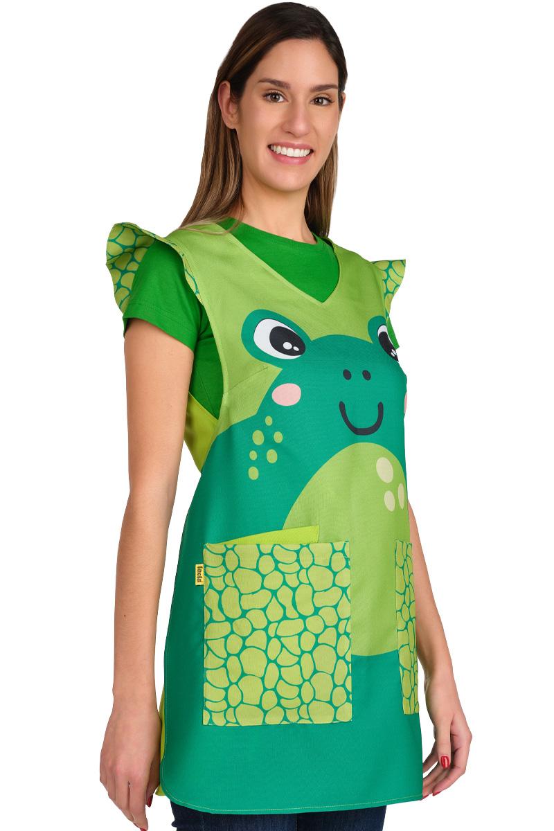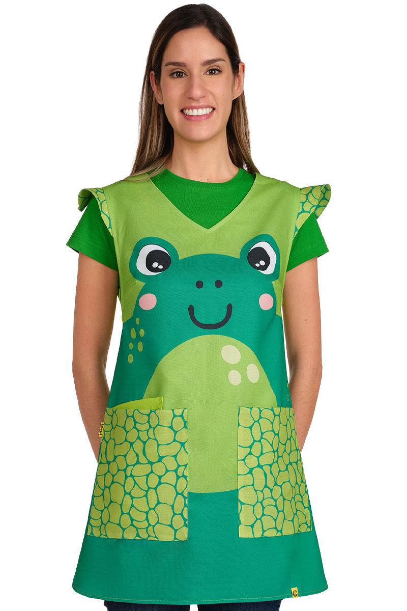 Este modelo destaca por su simpático estampado de rana en el delantero, ideal para crear un ambiente lúdico y cercano con tus alumnos. Para las docentes que buscan un toque distintivo, incorpora unos coquetos volantes en los hombros que aportan un aire femenino y original a tu uniforme diario.