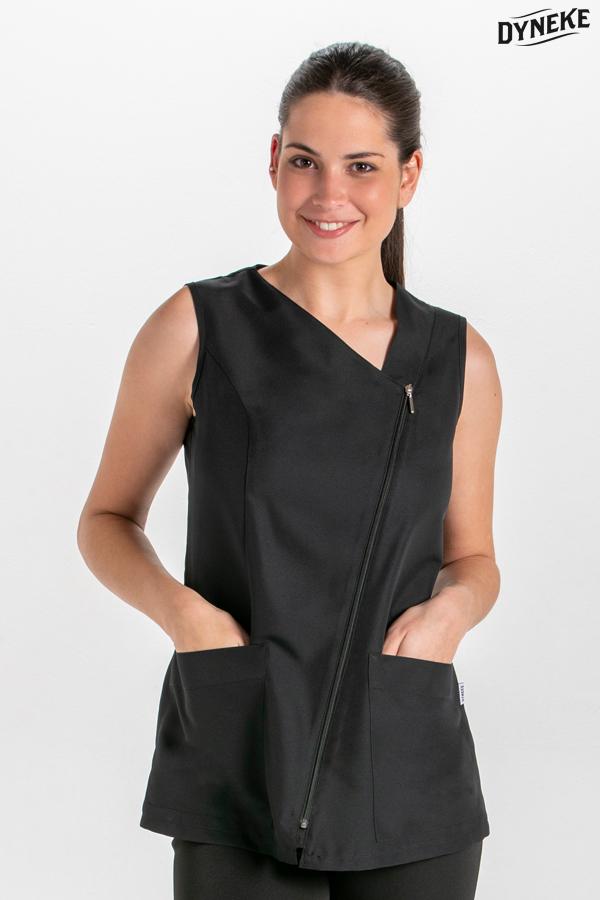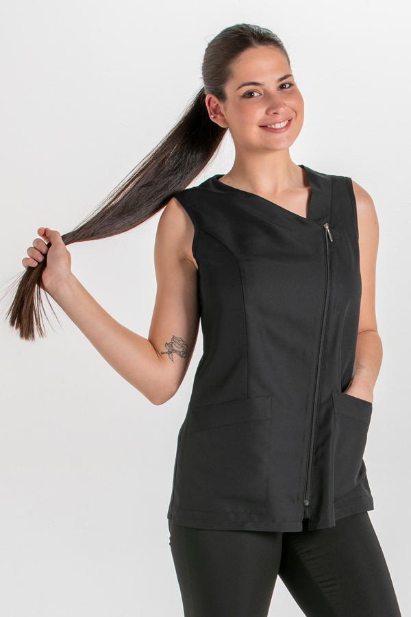 Chaqueta sin mangas fabricada en microfibra. Abrochada en diagonal con cremallera blanca. Dispone de bolsillos inferiores. Largo: 69 cm. Tallaje: SP-P-M-G-SG-SSG-XG. Prenda muy ligera, de secado rápido y fácil planchado. Propuestas: centros de estética, spa, comercios y dependencia en general.