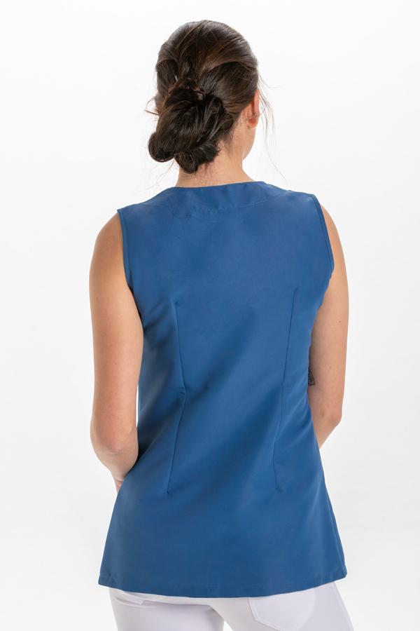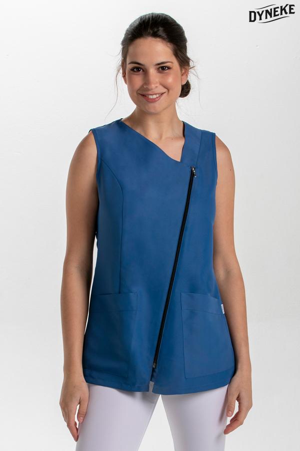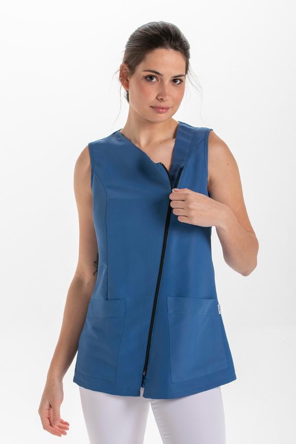 Chaqueta sin mangas fabricada en microfibra. Abrochada en diagonal con cremallera blanca. Dispone de bolsillos inferiores. Largo: 69 cm. Tallaje: SP-P-M-G-SG-SSG-XG. Prenda muy ligera, de secado rápido y fácil planchado. Propuestas: centros de estética, spa, comercios y dependencia en general.