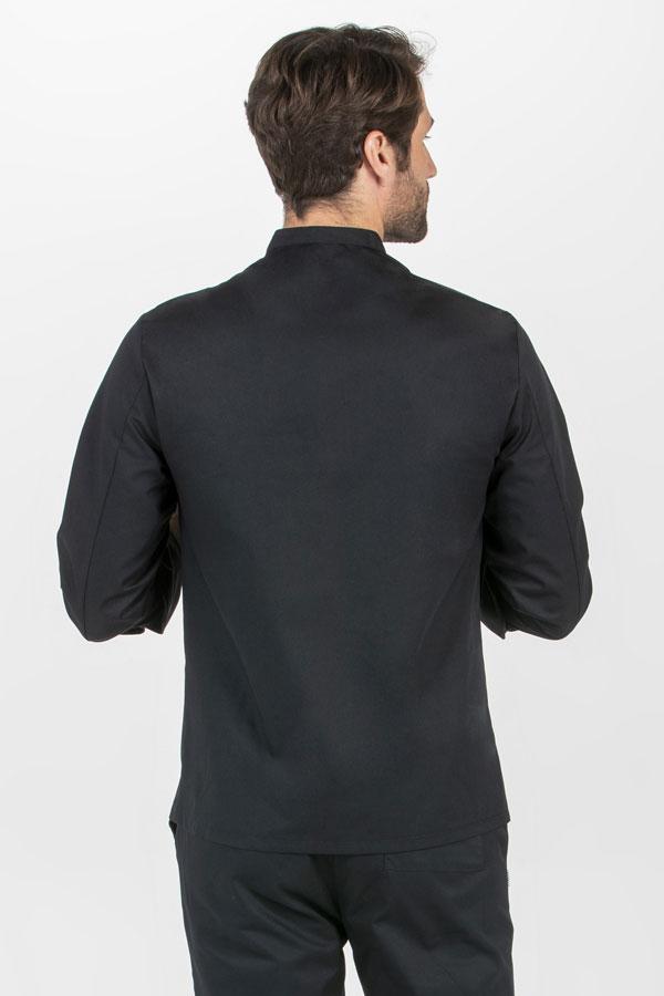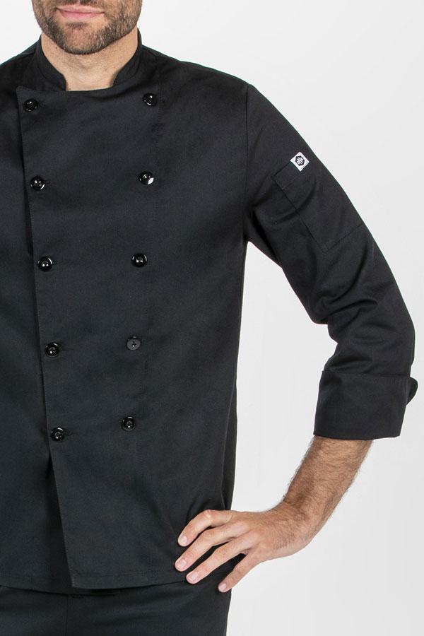 Chaqueta de cocinero de manga larga y puños vueltos. Color blanco. Cuello mao. Prenda entallada con cierre cruzado de doble botonadura. Bolsillo lateral en manga. Largo: 73 cms.