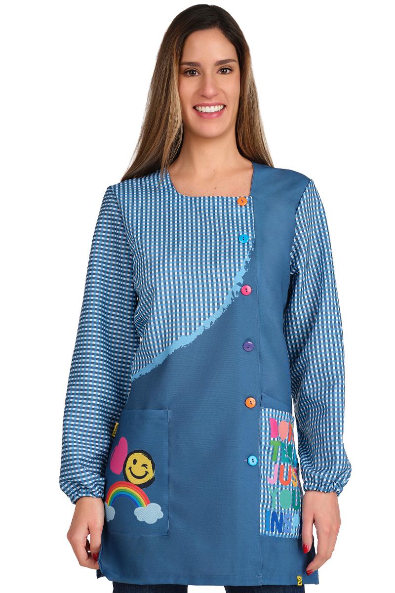 Eleva tu vocación con nuestra bata para profesora de diseño exclusivo, una prenda que combina alegría, motivación y funcionalidad en cada detalle.Este modelo destaca por su original combinación de estampado liso y cuadros clásicos en azul, creando un contraste dinámico que capta la atención de los más pequeños de forma inmediata.Lo que hace verdaderamente especial a esta bata es su mensaje positivo. En un bolsillo, un vibrante arcoíris junto a una sonrisa y un corazón irradian optimismo; en el otro, la frase inspiradora "Don't teach, just you inspire" recuerda el propósito más profundo de la enseñanza. Se abrocha en el lateral delantero con botones de colores, aportando un toque lúdico y divertido que enamora a los alumnos.Cuenta con 3 prácticos bolsillos de gran capacidad para que lleves contigo todo lo necesario durante la jornada.