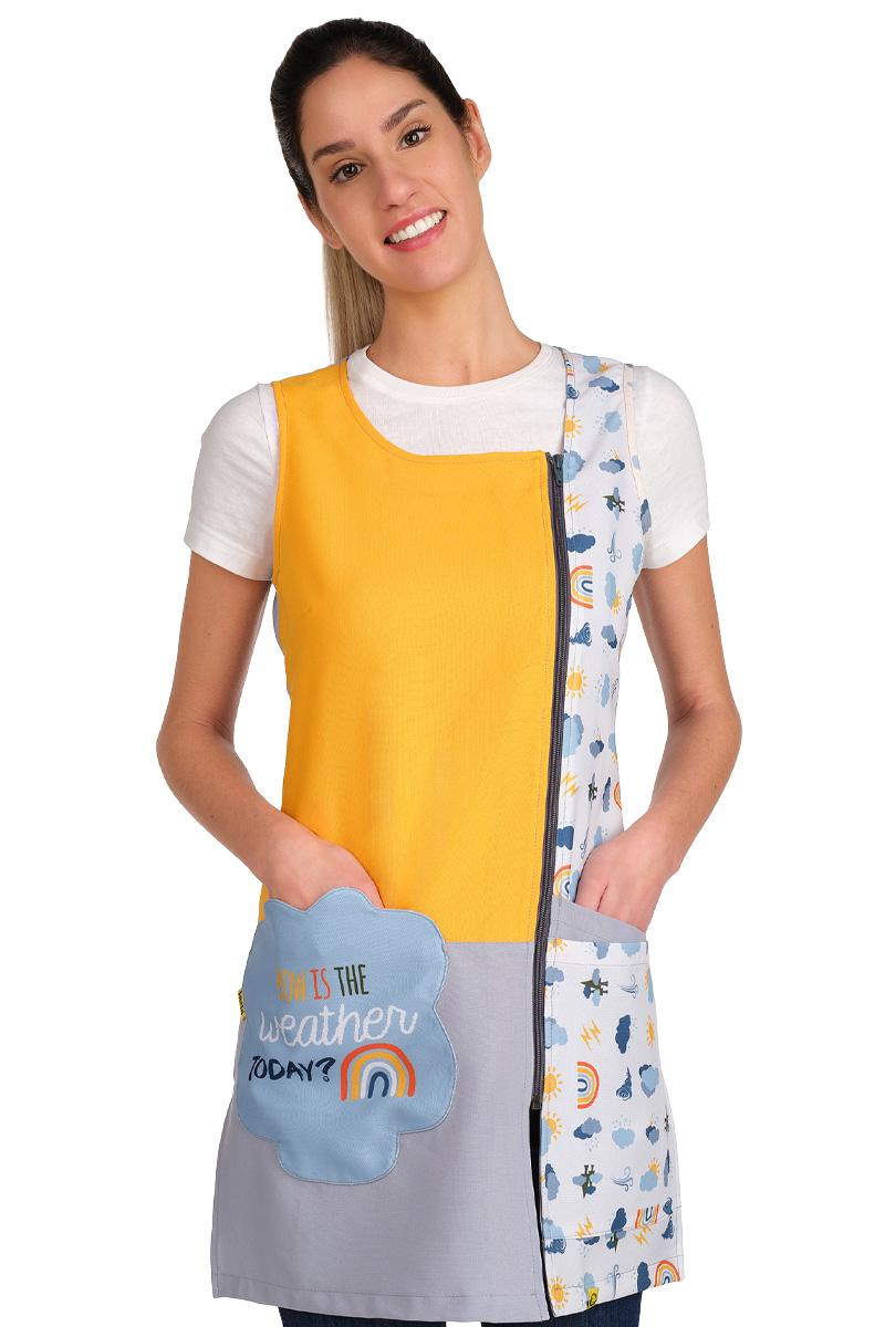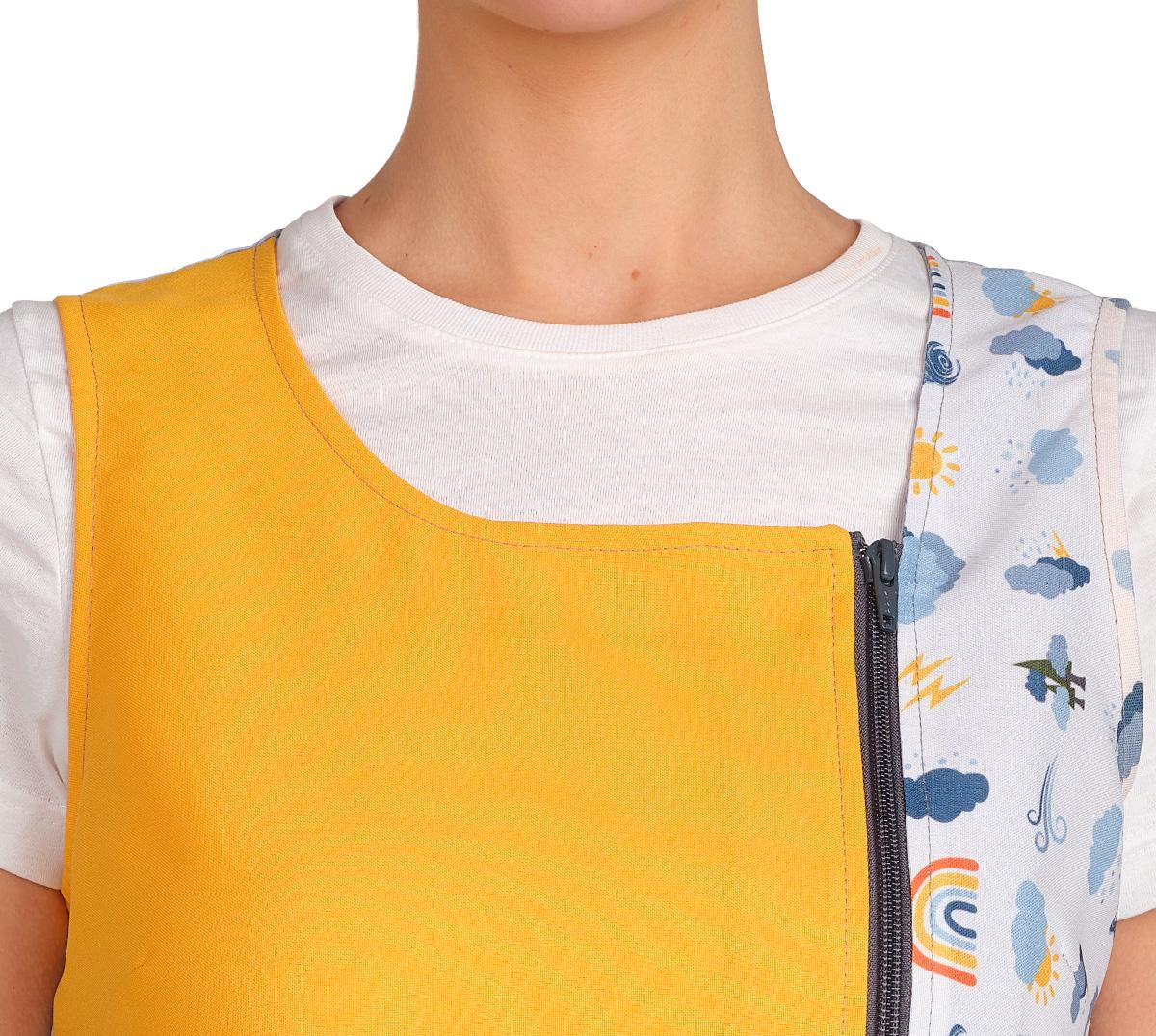 Una prenda única diseñada para despertar la curiosidad científica de tus alumnos.Este modelo destaca por su moderna combinación de tejido amarillo vibrante y gris perla, fusionada con un panel lateral de estampado didáctico sobre fenómenos meteorológicos.