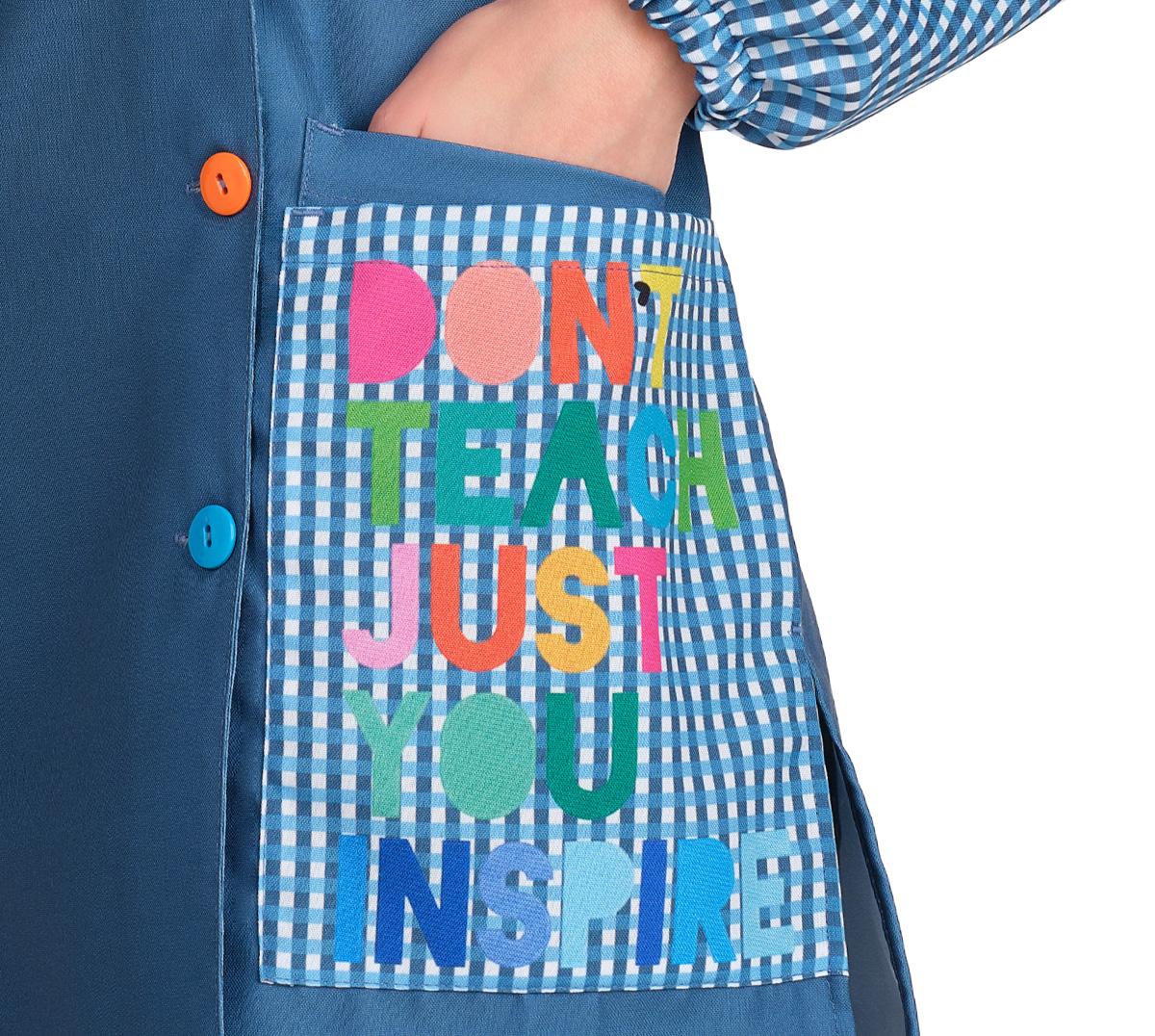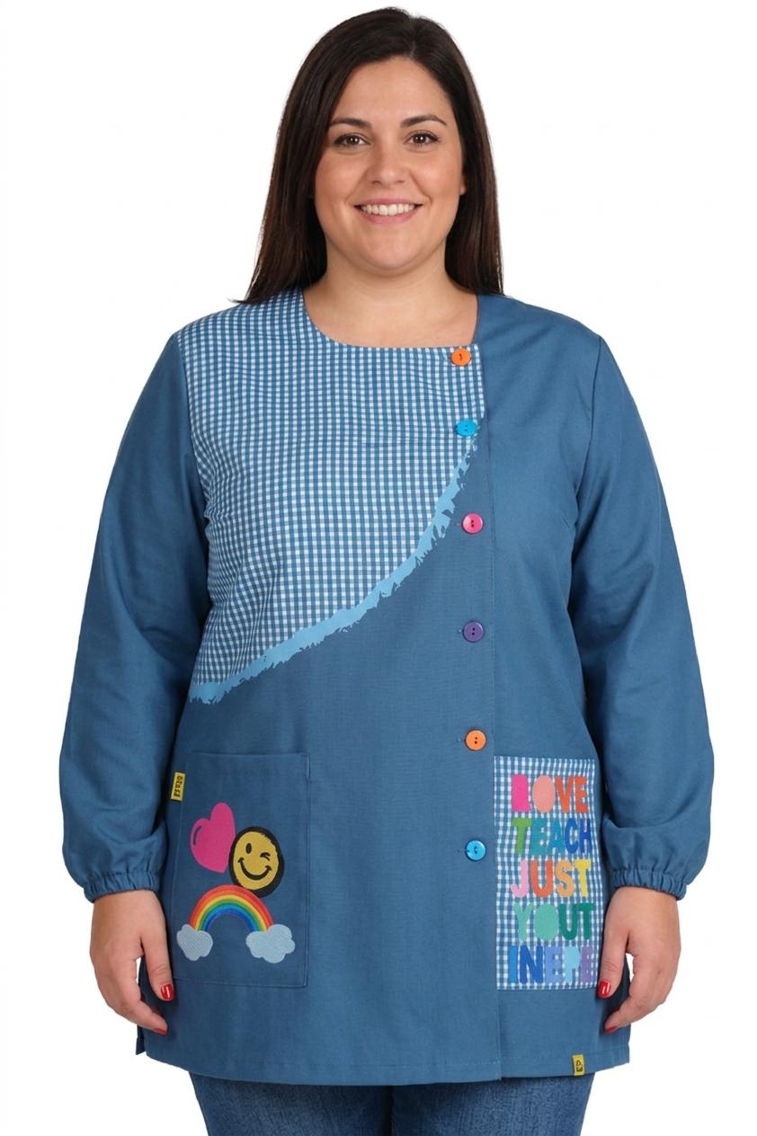 Eleva tu vocación con nuestra bata para profesora de diseño exclusivo, una prenda que combina alegría, motivación y funcionalidad en cada detalle.Este modelo destaca por su original combinación de estampado liso y cuadros clásicos en azul, creando un contraste dinámico que capta la atención de los más pequeños de forma inmediata.Lo que hace verdaderamente especial a esta bata es su mensaje positivo. En un bolsillo, un vibrante arcoíris junto a una sonrisa y un corazón irradian optimismo; en el otro, la frase inspiradora "Don't teach, just you inspire" recuerda el propósito más profundo de la enseñanza. Se abrocha en el lateral delantero con botones de colores, aportando un toque lúdico y divertido que enamora a los alumnos.Cuenta con 3 prácticos bolsillos de gran capacidad para que lleves contigo todo lo necesario durante la jornada.